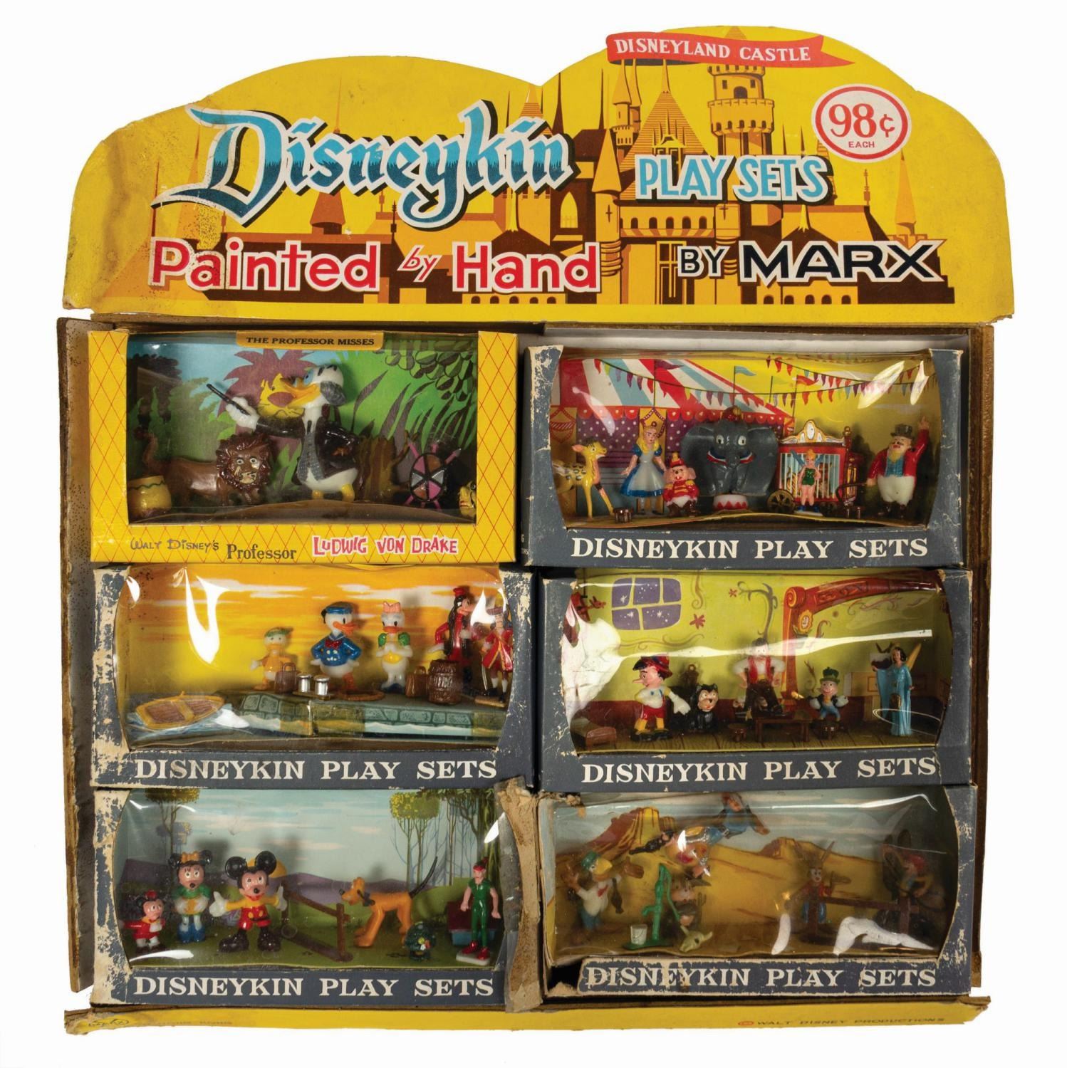 (Marx, 1961-62) A set of (6) vintage Disneykins figures playsets and a Series 1 store display manufactured by Marx. Each playset includes 6-8 hand painted Disney character figures and scenic elements. Of the (6) sets offered here, five are from Series 1 and include: Mickey Mouse and Friends, Gepetto's Shop, Dumbo's Circus, Donald Duck & Friends on Pier, and Panchito's Western Scene. The remaining set, featuring Professor Ludwig von Drake, is titled "The Professor Misses" and was released as part of the separate Ludwig von Drake line. The playset boxes measure 3.25"x6.25" and 1.75" deep and the display is 16.25"x13.75" and 1" deep. Unopened, the figures in each set are in generally very fine, as-new condition, though the Panchito figure is loose within the box. The boxes show varying degrees of wear, with some surface loss, edge wear, denting, amateur tape repair to one, loosening of the plastic display windows, and general handling. The display exhibits some staining, edge wear, and a missing side panel. The Disneykins sign panel at the top has separated from the body.