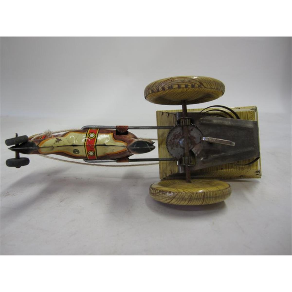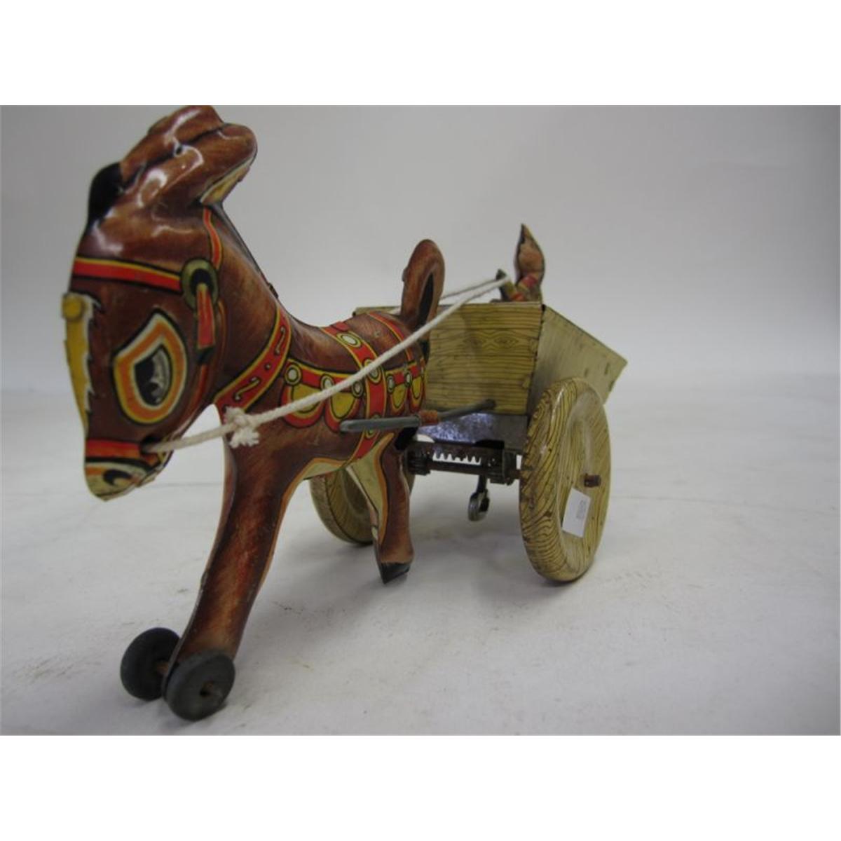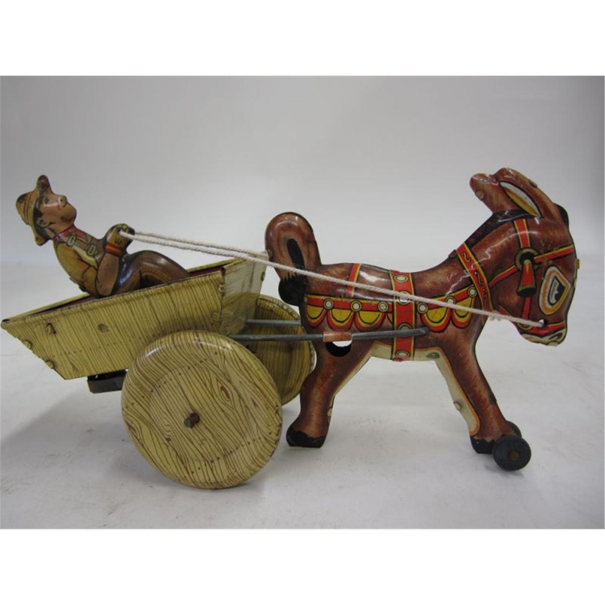 For sale is this vintage, old fashioned Marx Donkey Cart toy. The toy is in good condition, with the vast majority of the original paint still intact. There are a few small scrapes and scratches, but they do not detract from the unique image of the toy.