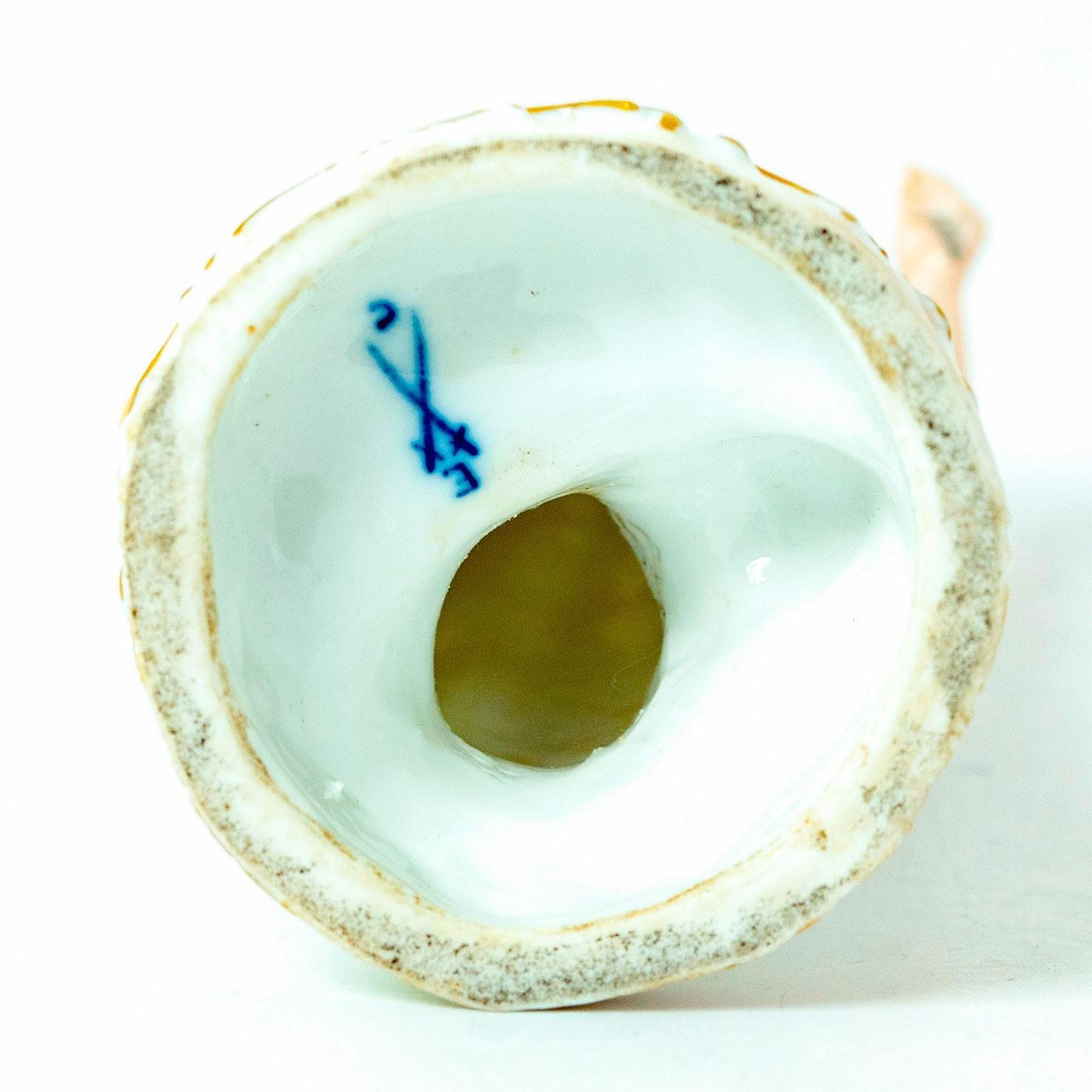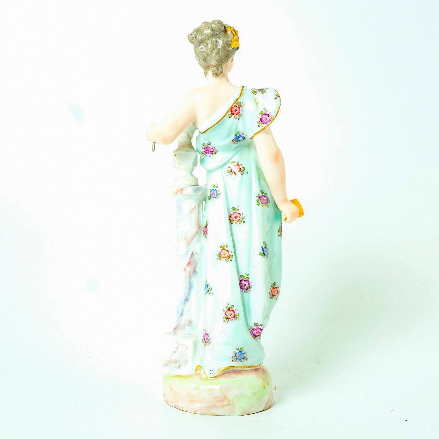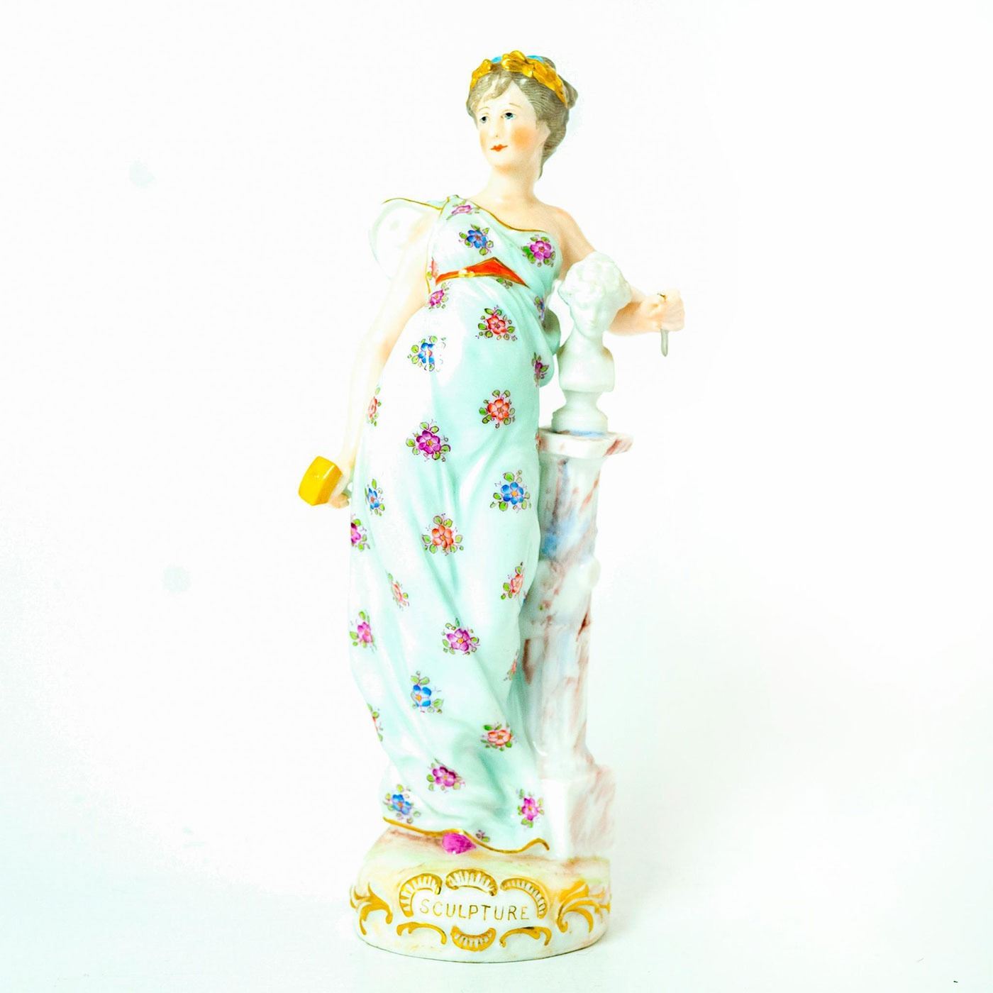 French porcelain figure of a lady sculptor standing by her work. Hand painted; finely painted details. Floral design on dress; gilt accents. Titled on base. Marx Eugene Clauss backstamp. Chips to both tools in hands; as-is.