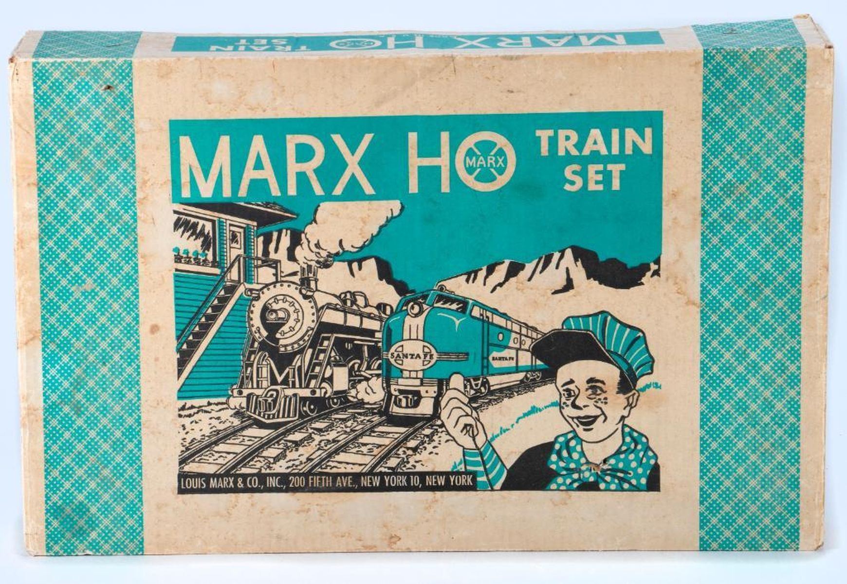 Marx 79542 New York Central Set 6096 Die Cast NYC Hudson Locomotive and Tender. Steps, trucks and coupler intact. 3281 Santa Fe oranges box car. Roof walk ends, trucks and couplers intact. Missing one door but door guides are intact. X415 Rocket Fuel Tank Car. Missing two steps. Hand rails, trucks and couplers intact. 20298 NYC Caboose. Roof walk ends, roof corners, steps, trucks and couplers intact. no stack. (12) pieces curve track with road bed. (1) piece straight track with roadbed, (1) piece straight track with retailer, uncoupler, terminals. Strombecker power pack. Original box and insert, but insert has crack. Marx HO Remote Control Electric Train/Battery Type Reversing Locomotive. 0-4-0 Steam type locomotive. Drive Wheels are loose but present. Tender with solid knuckle coupler. Gray Western Maryland Fast Freight Gondola with solid knuckle couplers. Tuscan New York Central Bay Window Caboose with solid knuckle couplers. Stack, roof walk ends, roof corners, end rails, steps - intact. Trucks each missing one side frame. Wheel sets and broken side frame pieces are present. (12) curve track, (1) half straight track, (1) rerailer/terminal track. Battery/controller building. No corrosion. Original set box and some internal boxes./dividers. Marx HO set number 16470. 1962 Rock Island Diesel Switcher locomotive. Cab roof ends, couplers, window mullions - intact. 77000 Boston and Main Blue Box Car. Roof walk ends, steps, doors, door guides, trucks and couplers - intact. 36000 Black C & O Gondola, steps, trucks and couplers intact. 1961 Black/red/white Rock Island Caboose. Roof walk, roof corners, antenna, end rails, ladders, brake wheels, trucks and couplers - intact. Rust on end rails. (12) curve track. Marx HO Power Pack. Set Box with plastic and cardboard inserts.