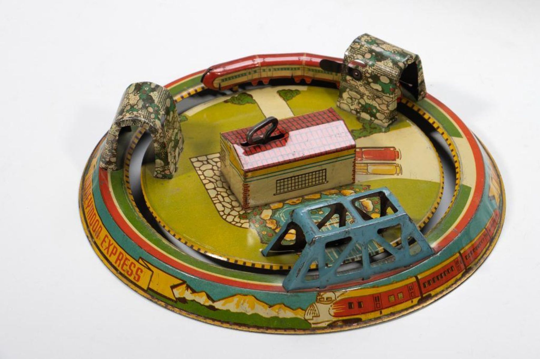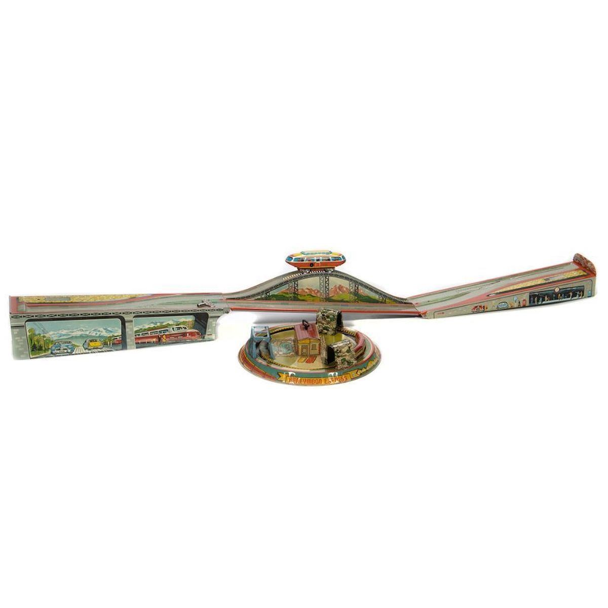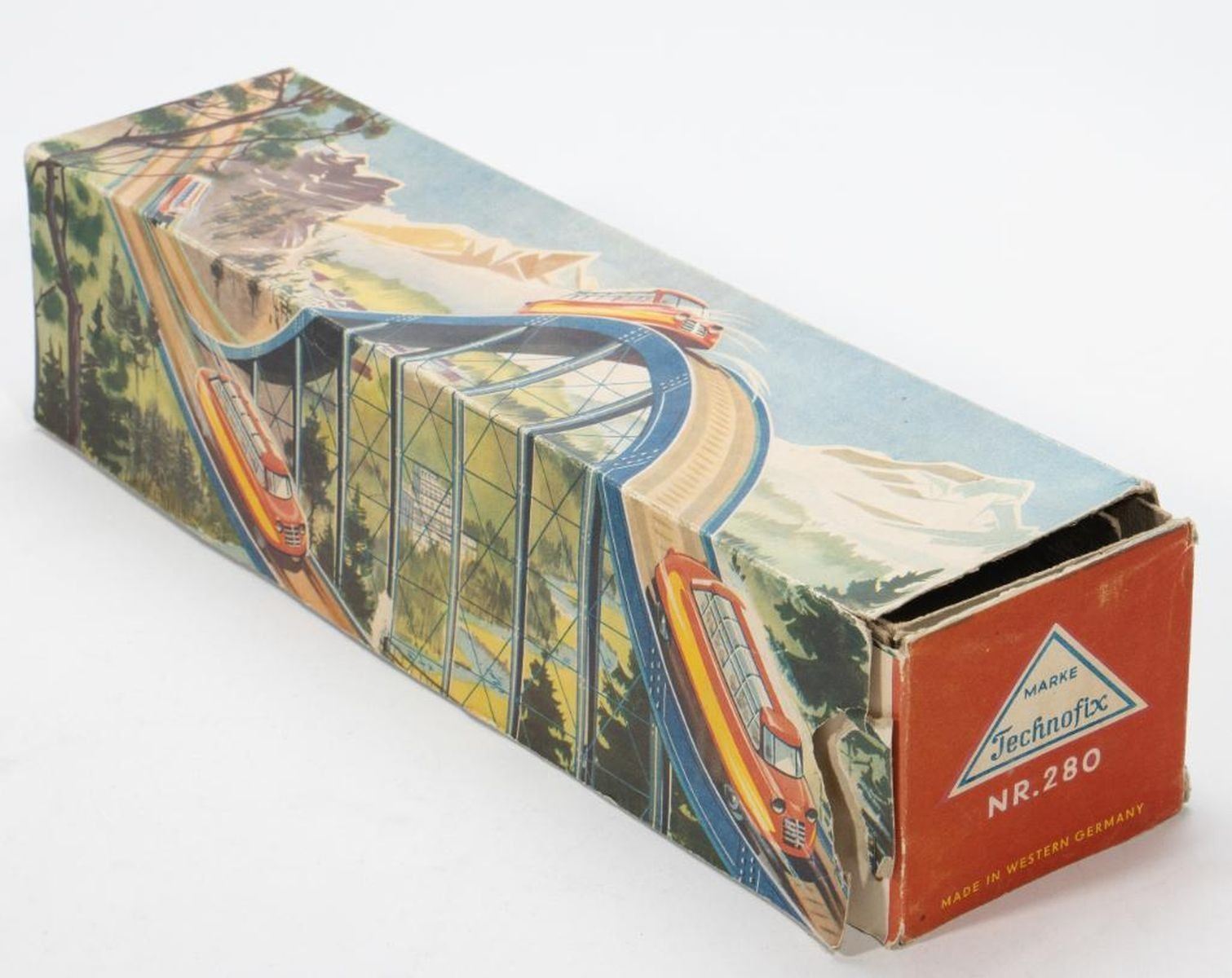 Marx windup Union Pacific M10000 Honeymoon Express with station, two tunnels and a bridge Technofix Number 280 three section roller coaster with car and key, in original box - on end of box is detached but present.