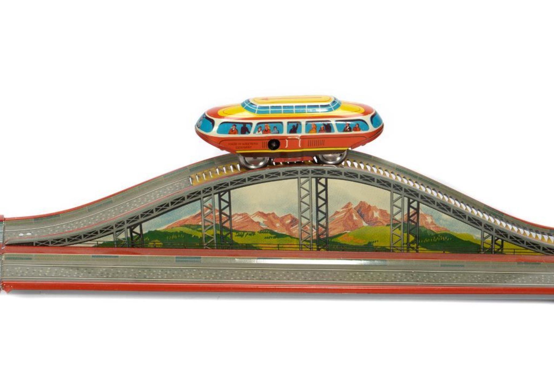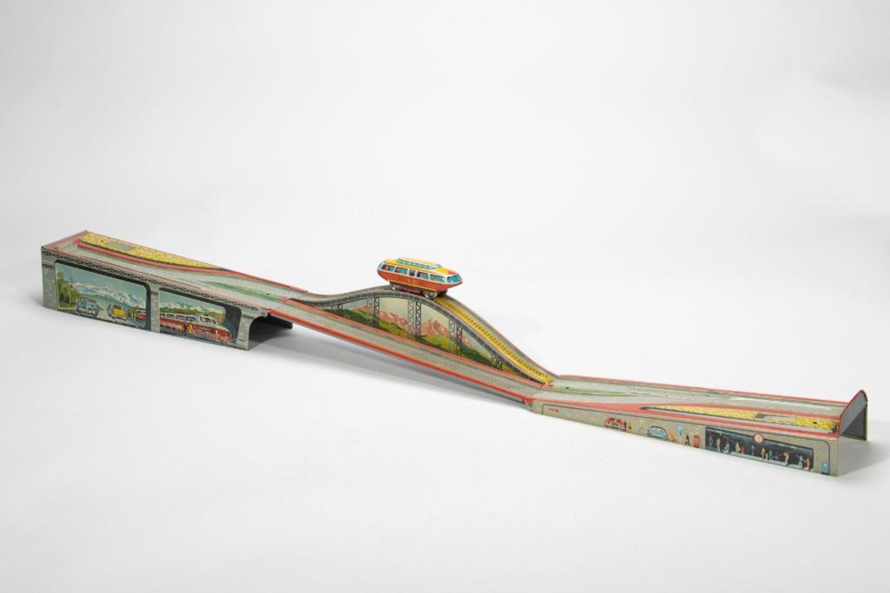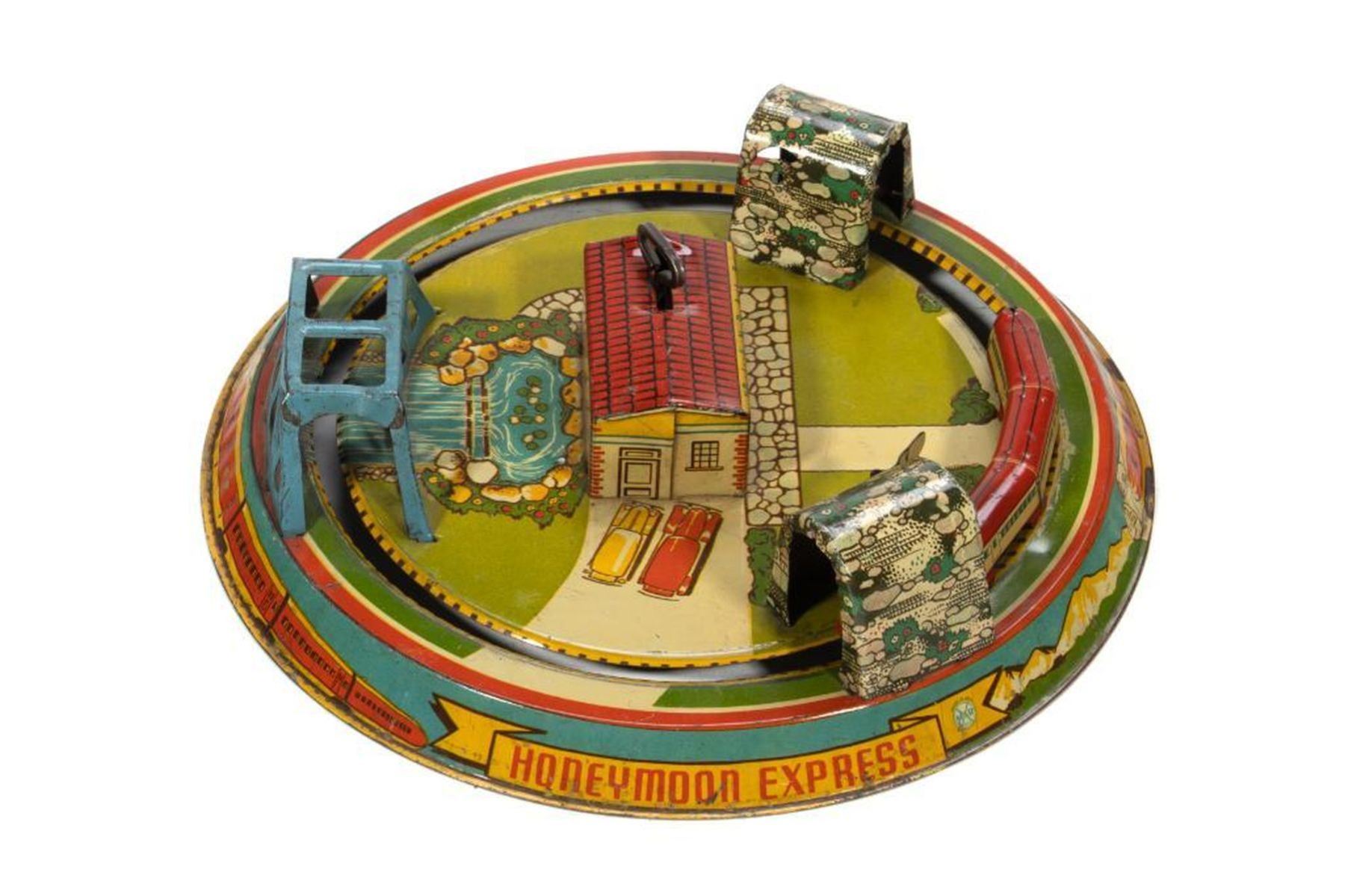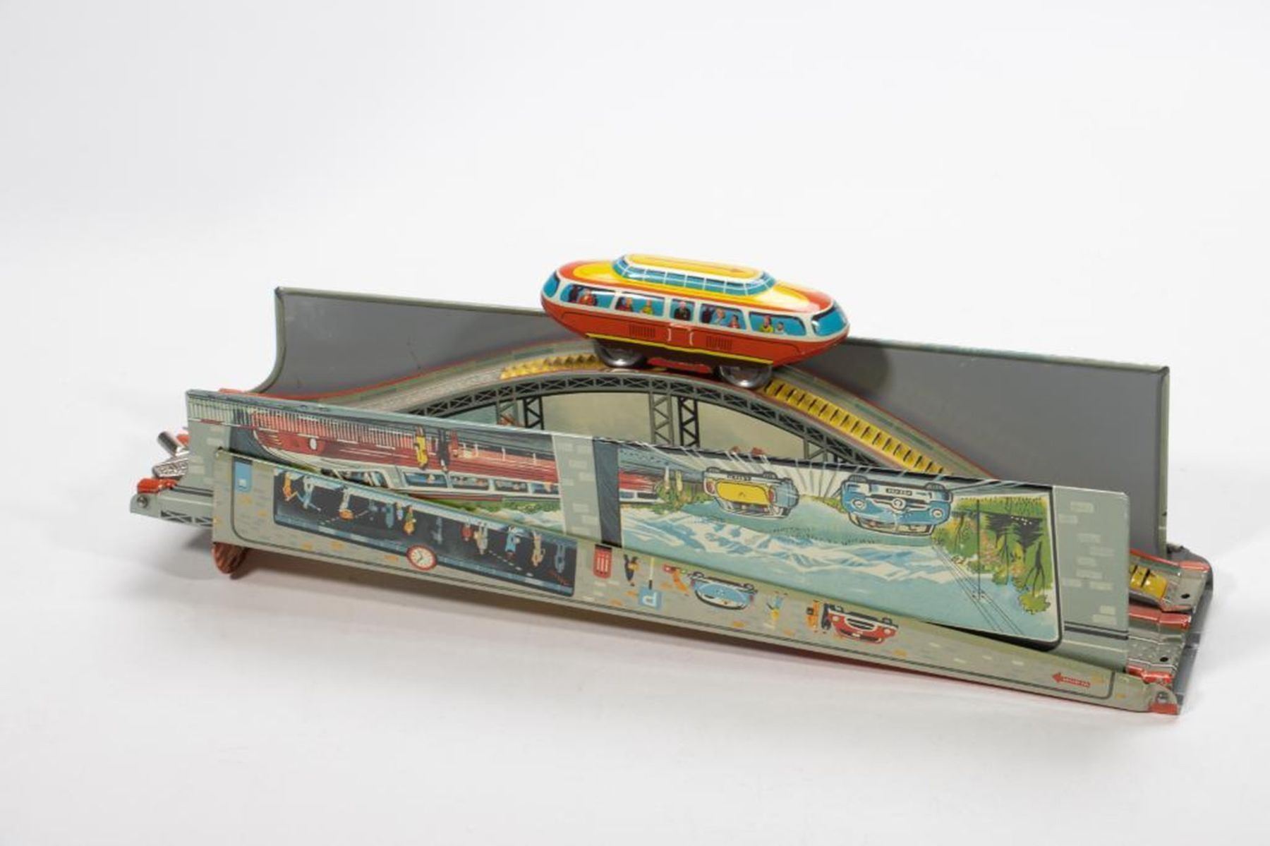Marx windup Union Pacific M10000 Honeymoon Express with station, two tunnels and a bridge Technofix Number 280 three section roller coaster with car and key, in original box - on end of box is detached but present.