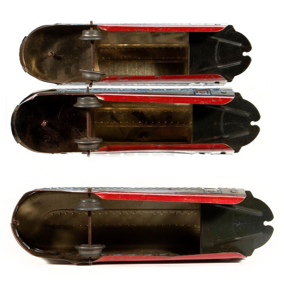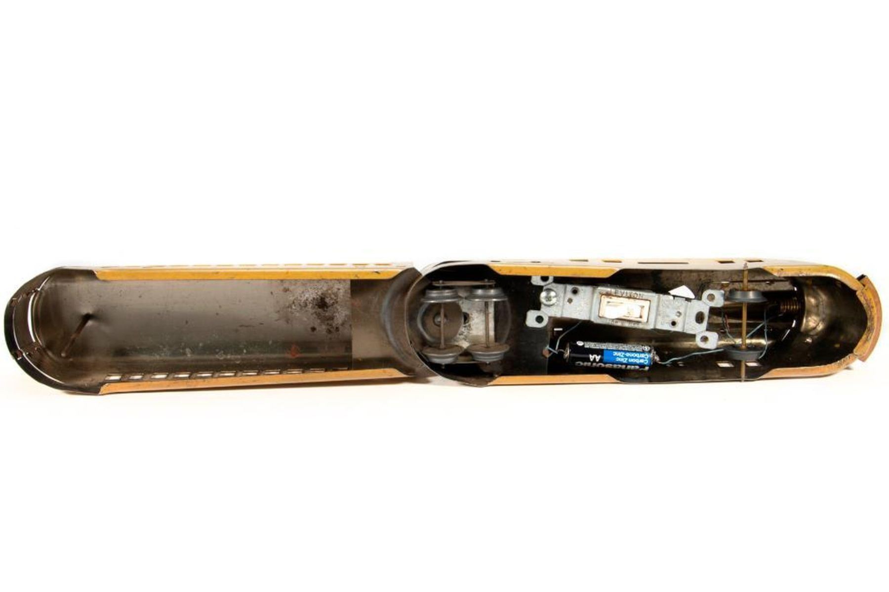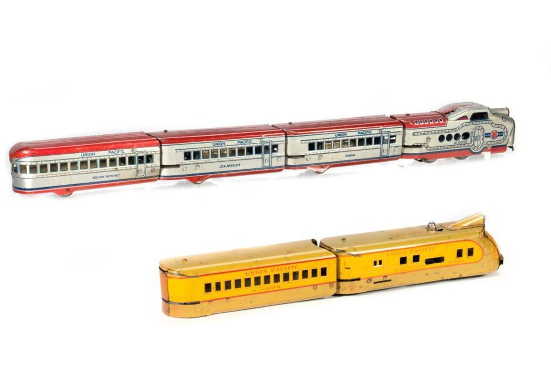 Heavily modified M10000 Yellow/Brown power unit and one car, M10005 Power unit with electric motor. some scratches in silver, red, blue lithography. Omaha coach - some scratches in silver, red, blue lithography, small dents, dirt. Los Angeles coach - some scratches in silver, red, blue lithography, Squaw Bonnet observation - some scratches in silver, red, blue, lithography. M10000 - yellow, tan, red body. Motor is missing. Battery and switch connected to headlight installed.. Battery is dead. Body has scratches and dirt. Union Pacific coach 0 yellow, tan, red body. Missing wheels and truck assembly. Body has scratches and dirt.
