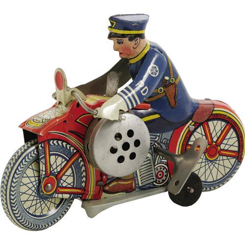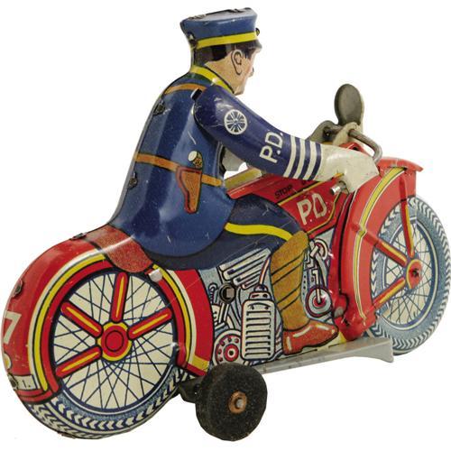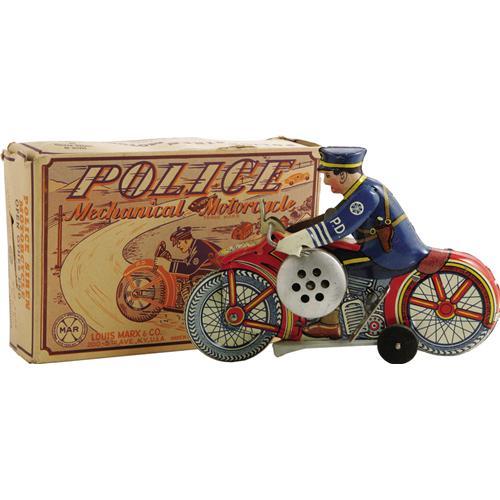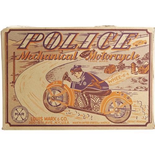 <B>Marx <I>Mechanical Police Siren Motorcycle</B></I></B></I> <B>in Original Box</B></I><BR>Tin toy with lithographed design of a policeman riding a motorcycle. Siren mounted on right side and working "brake," 5.5" high and 8.5" long. Maker's mark is incorporated into the design on front fender. <BR><B>Condition</B></I>- Toy has some light surface scratches to paint, and includes original key. In very good to near fine condition with original complete box in comparable condition.<BR><BR><b>Shipping:</b> Miscellaneous Collectibles, Larg (<a target="_blank" href="http://www.heritageauctions.com/common/shipping.php">view shipping information</a>)