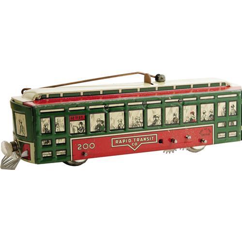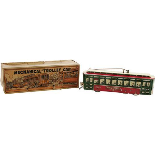 <B>Marx <I>Mechanical Trolley Car</B></I></B></I> <B>in Original Box.</B></I> <BR>Tin litho with good detail, 2.75" x 3" x 9" long, Marx maker's mark incorporated into design at rear of car. <BR><B>Condition</B></I>- Box has some tearing, with minor paper loss, end flap detached, some soiling, and light dampstain. Toy near mint, likely unused.<BR><BR><b>Shipping:</b> Miscellaneous Collectibles, Larg (<a target="_blank" href="http://www.heritageauctions.com/common/shipping.php">view shipping information</a>)