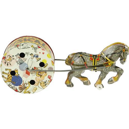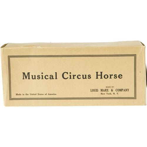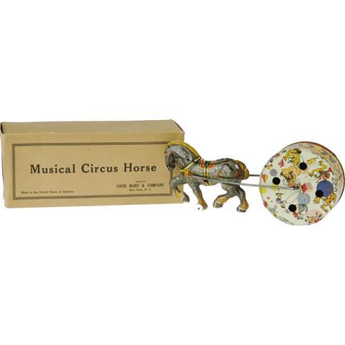 <B>Marx <I>Musical Circus Horse</B></I></B></I> <B>in Original Box.</B></I><BR>Tin toy horse, pulling a musical wheel, 4.5" high and 10" long, with all working and sounding parts.<BR><B>Condition</B></I>- Box complete and near fine. Toy near mint. <BR><BR><b>Shipping:</b> Miscellaneous Collectibles, Larg (<a target="_blank" href="http://www.heritageauctions.com/common/shipping.php">view shipping information</a>)