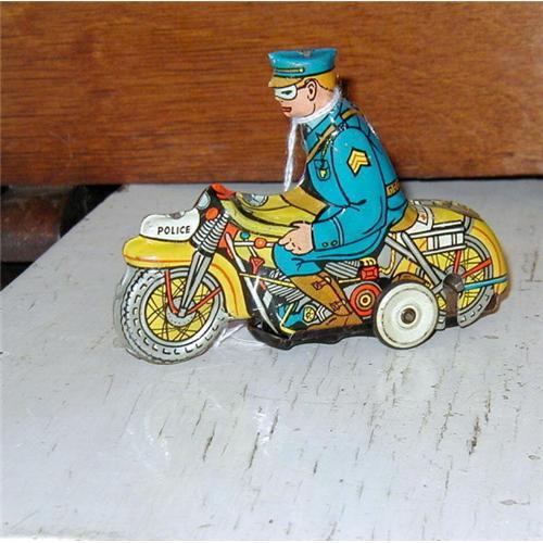 Marx policeman riding a motorcycle friction toy with great graphics. Police written on the front. The cop is blue and the motorcycle is yellow and it has 2 wheels. Buyer pays shipping and handling costs.