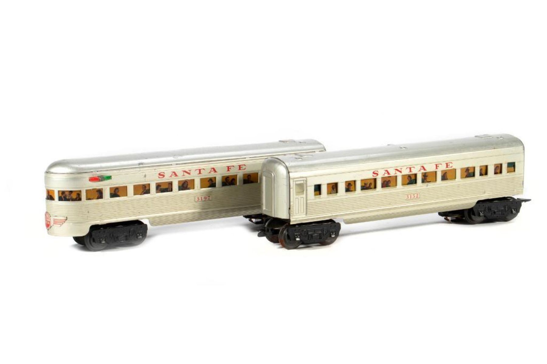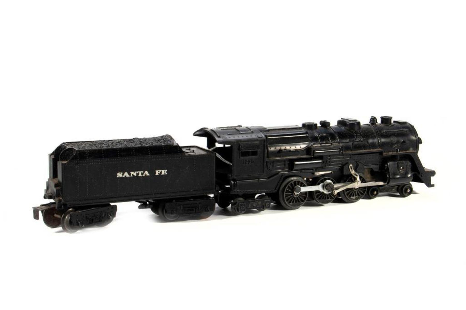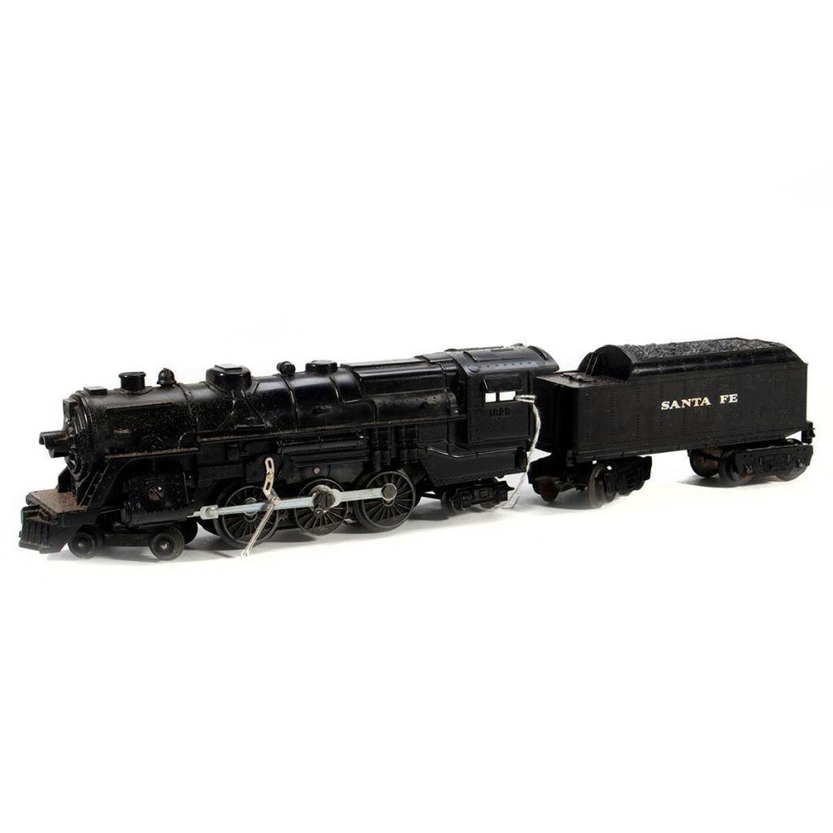 with 1829 Hudson Locomotive, Santa Fe Tender, 3152 Santa Fe Coach, 3152 Santa Fe Vista Dome, 3197 Santa Fe Observation. Track, Transformer, Remains of Set Box, 1829 Smoking Hudson 4-6-4 Locomotive. Plastic boiler. Valve gear linkage loose on one side. Cab roof intact. Santa Fe Tender. Steps, trucks and coupler intact. Rust on wheels and axles. 3152 Santa Fe Coach. Small scratches in paint. Trucks and couplers intact. Rust on wheels and axles. 3152 Santa Fe Vista Dome. Scratches in paint, rust on one side of body. Vista Dome, trucks and couplers intact. 3197 Santa Fe Observation. Scratches in paint. Marker lights, drum head label, trucks and coupler intact. Rust on wheels and axles. Track and transformer with rust.