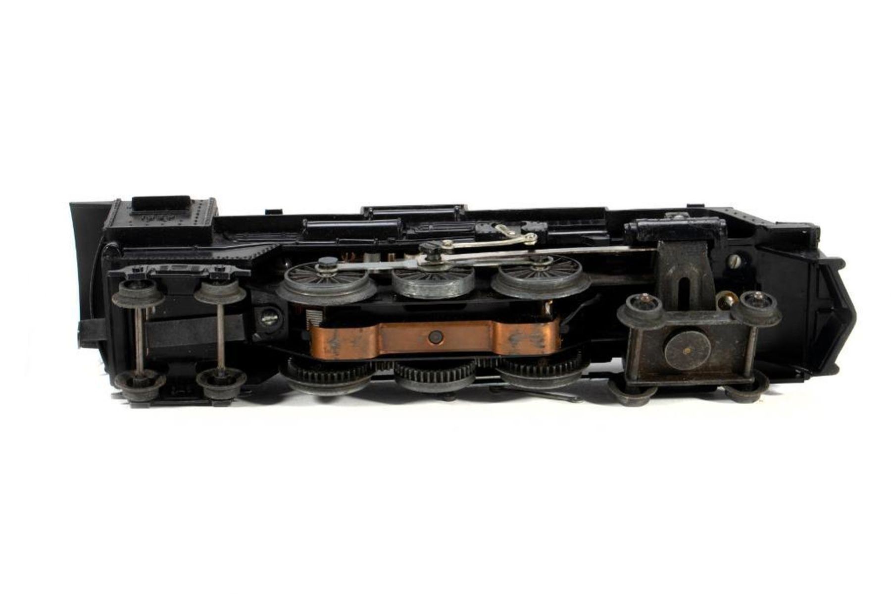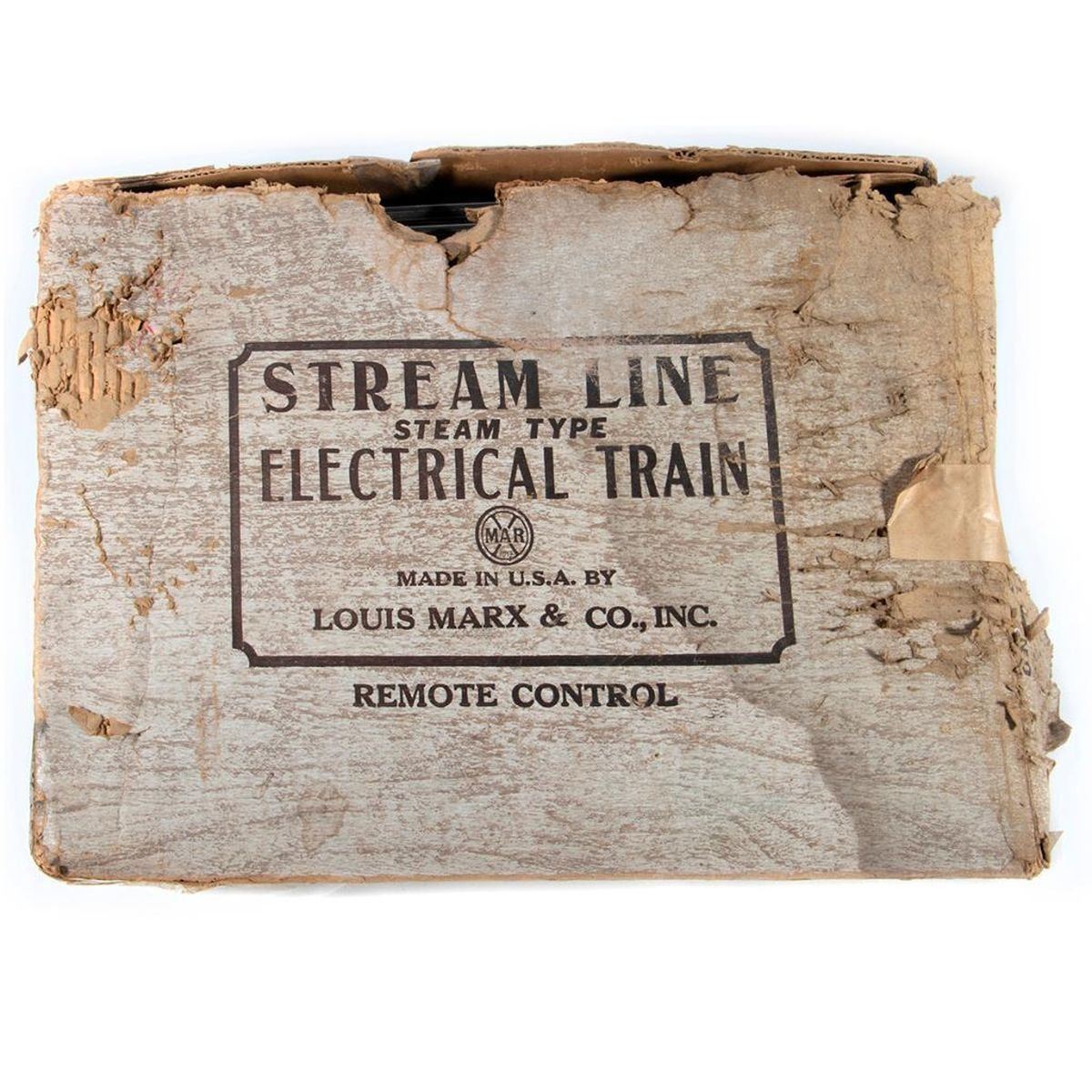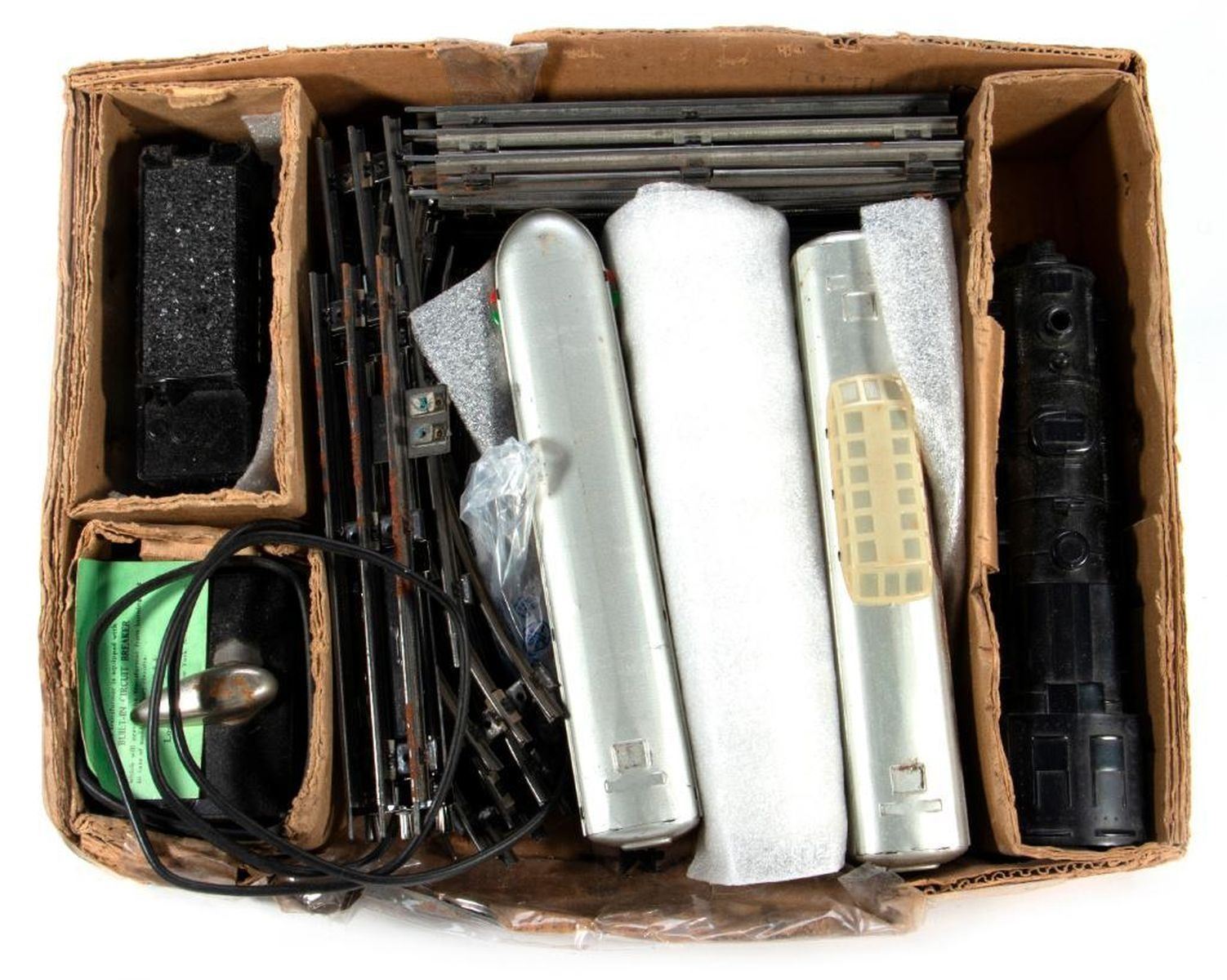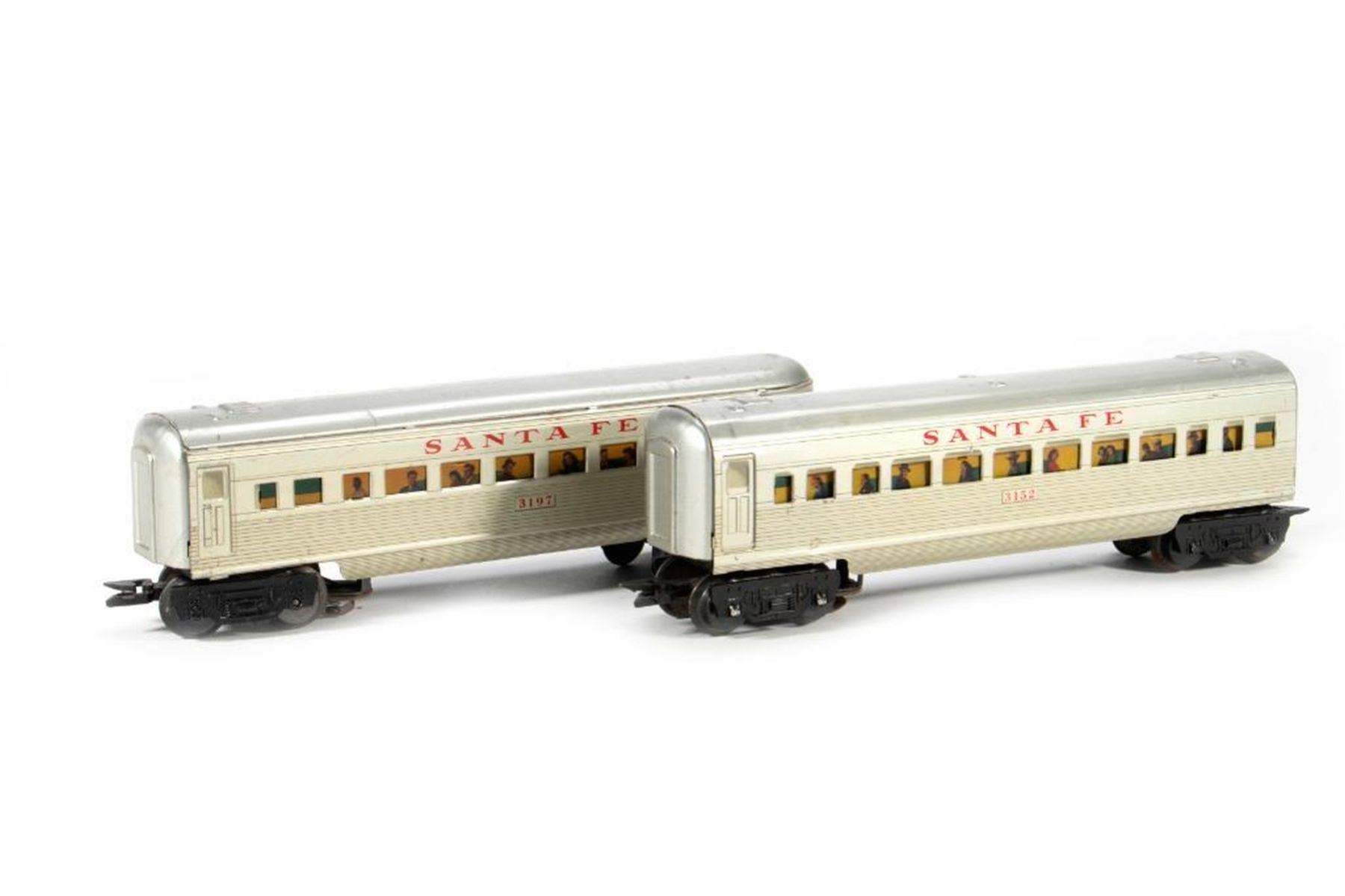 with 1829 Hudson Locomotive, Santa Fe Tender, 3152 Santa Fe Coach, 3152 Santa Fe Vista Dome, 3197 Santa Fe Observation. Track, Transformer, Remains of Set Box, 1829 Smoking Hudson 4-6-4 Locomotive. Plastic boiler. Valve gear linkage loose on one side. Cab roof intact. Santa Fe Tender. Steps, trucks and coupler intact. Rust on wheels and axles. 3152 Santa Fe Coach. Small scratches in paint. Trucks and couplers intact. Rust on wheels and axles. 3152 Santa Fe Vista Dome. Scratches in paint, rust on one side of body. Vista Dome, trucks and couplers intact. 3197 Santa Fe Observation. Scratches in paint. Marker lights, drum head label, trucks and coupler intact. Rust on wheels and axles. Track and transformer with rust.