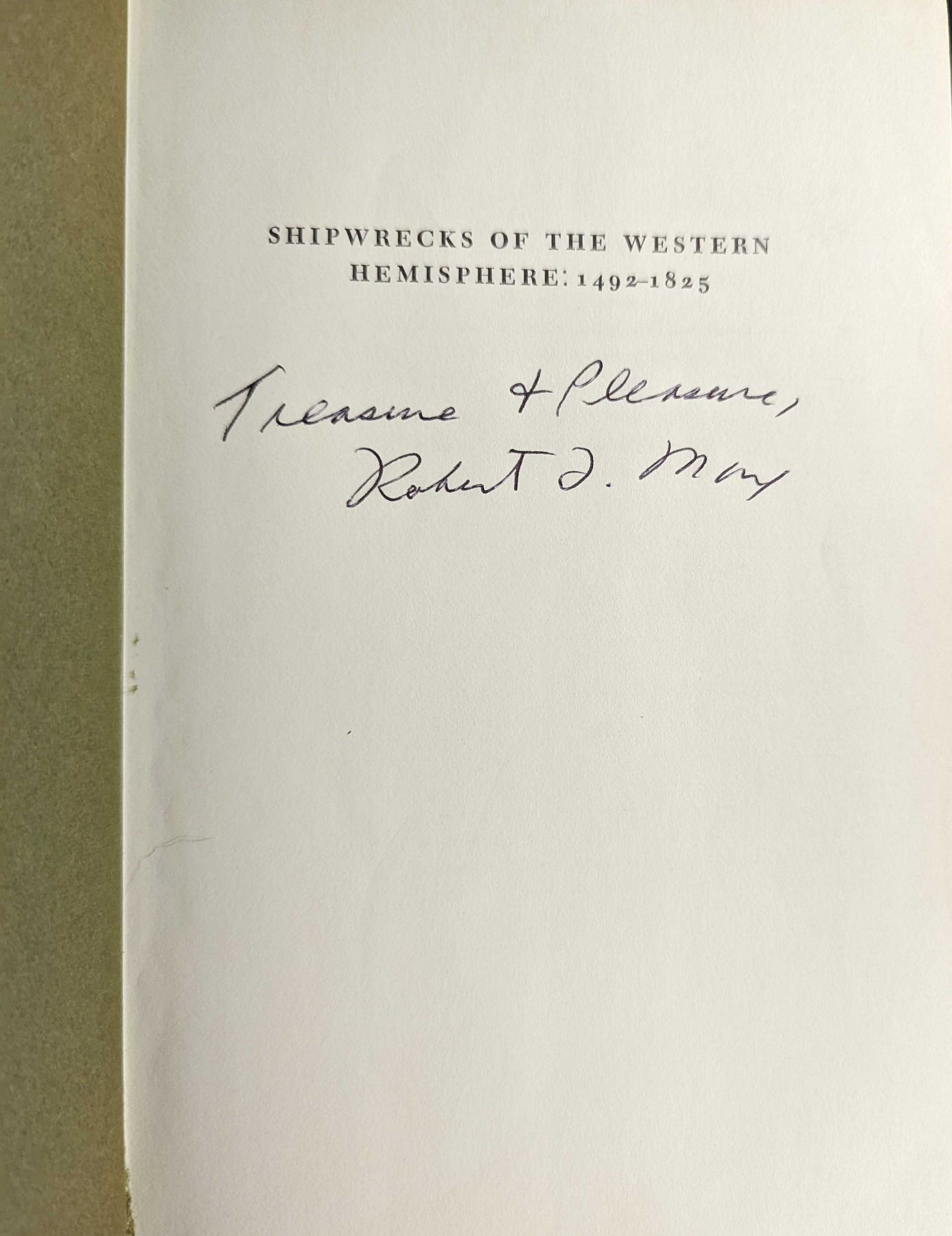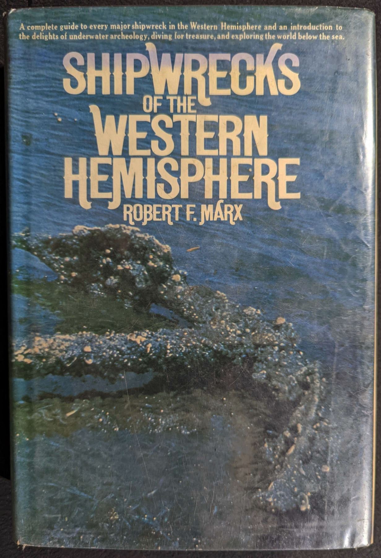 Marx, Robert F. SHIPWRECKS OF THE WESTERN HEMISPHERE. The World Publishing Company. 1971. 8vo. (2), xxii, (2), 482, (4) pages. Cleveland. first edition. original tan cloth, gilt; protected dust jacket. frontispiece. illustrated. maps. near Very Good. withdrawn from Garden City Public Library. inscribed by the author. This book is primarily a comprehensive listing of significant Western Hemisphere shipwrecks from 1492-1825, organized geographically. The area encompassed spans from Canada to South America. It also includes a short overview of locating shipwrecks, salvage, dating and preserving artifacts, and archaeological techniques. Lot weight: 2 lbs 5oz. Subject(s): Sunken Treasure.