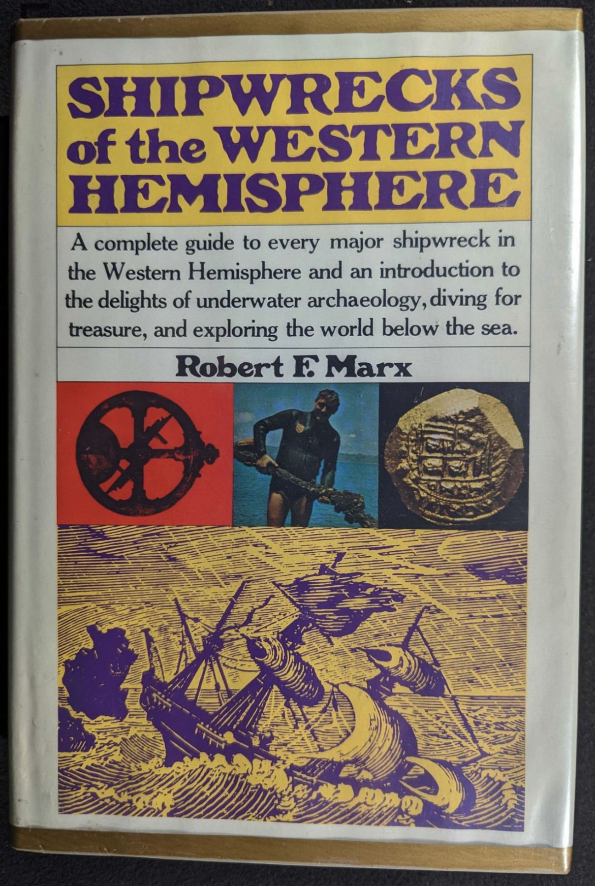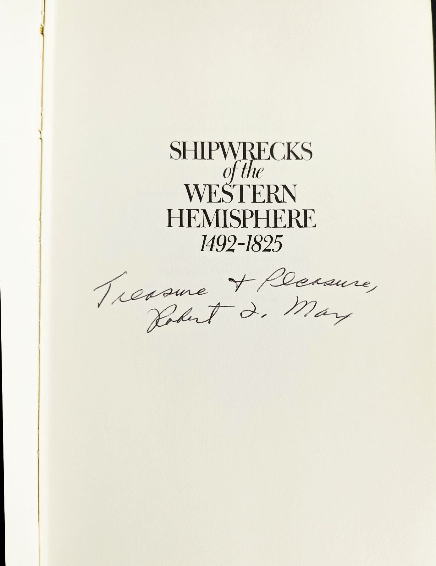 Marx, Robert F. SHIPWRECKS OF THE WESTERN HEMISPHERE. David McKay Company. 1975. 8vo. (4), xxii, (2), 482, (8) pages. Cleveland. first edition. original black cloth, gilt; protected dust jacket. frontispiece. illustrated. maps. near Very Good. withdrawn from Cuyahoga County Public Library. inscribed by the author. This book is primarily a comprehensive listing of significant Western Hemisphere shipwrecks from 1492-1825, organized geographically. The area encompassed spans from Canada to South America. It also includes a short overview of locating shipwrecks, salvage, dating and preserving artifacts, and archaeological techniques. Lot weight: 2 lbs 6oz. Subject(s): Sunken Treasure.