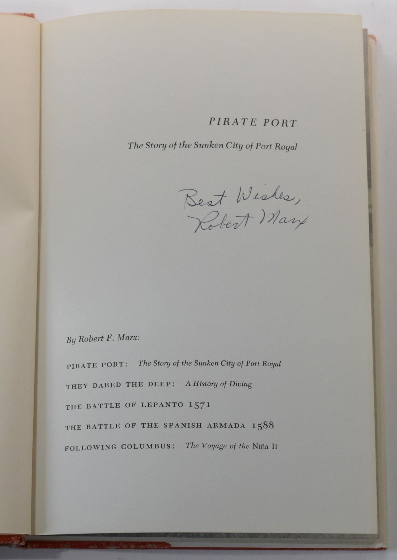 Marx, Robert F. (Signed) PIRATE PORT: THE STORY OF THE SUNKEN CITY OF PORT ROYAL. The World Publishing Company. 1967. 8vo, 190 pages; Hardcover w/ DJ; Signed by the author; dust jacket has some chips and tears; This book is the story of the author's archaeological exploration of the city of Port Royal, Jamaica, which sank into the ocean in a 1692 earthquake. Subject: Archaeology - Underwater