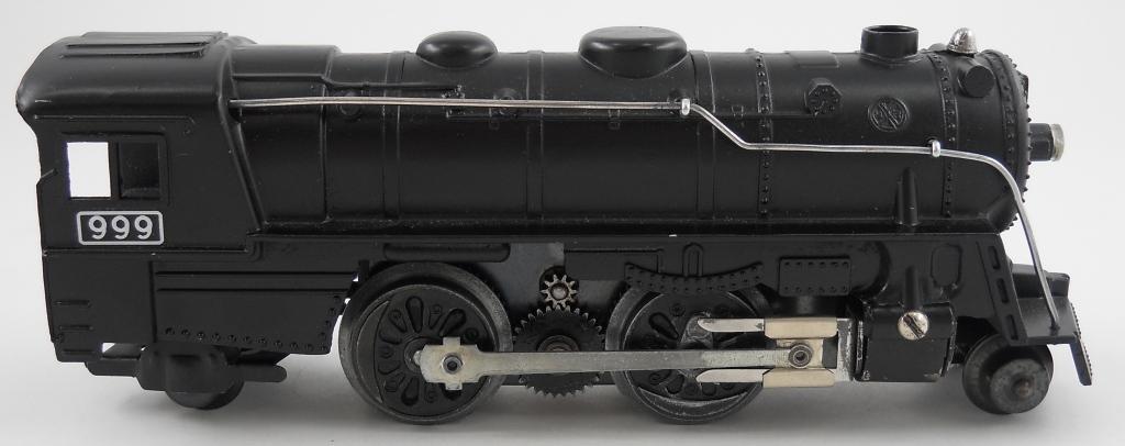 This set has a die-cast engine (number 999); the other cars are pressed tin. All are in good condition, with some scrapes to the engine and other cars from use. Please check the pictures for your best description. We believe this is an "0" scale train set.