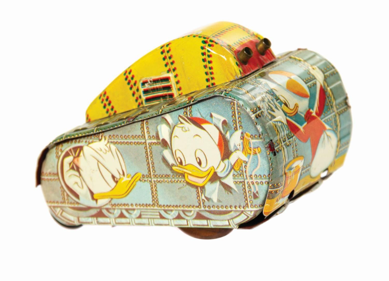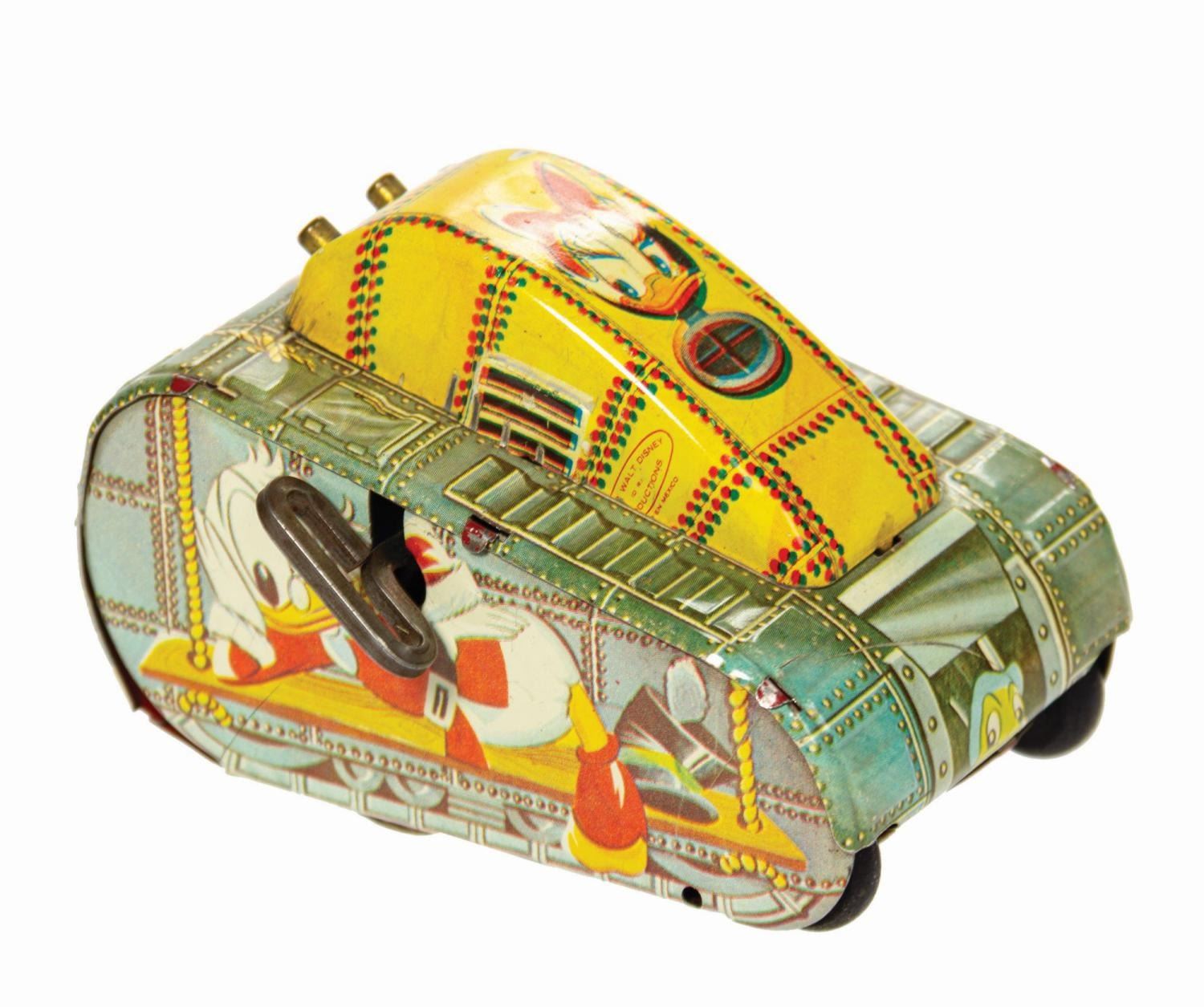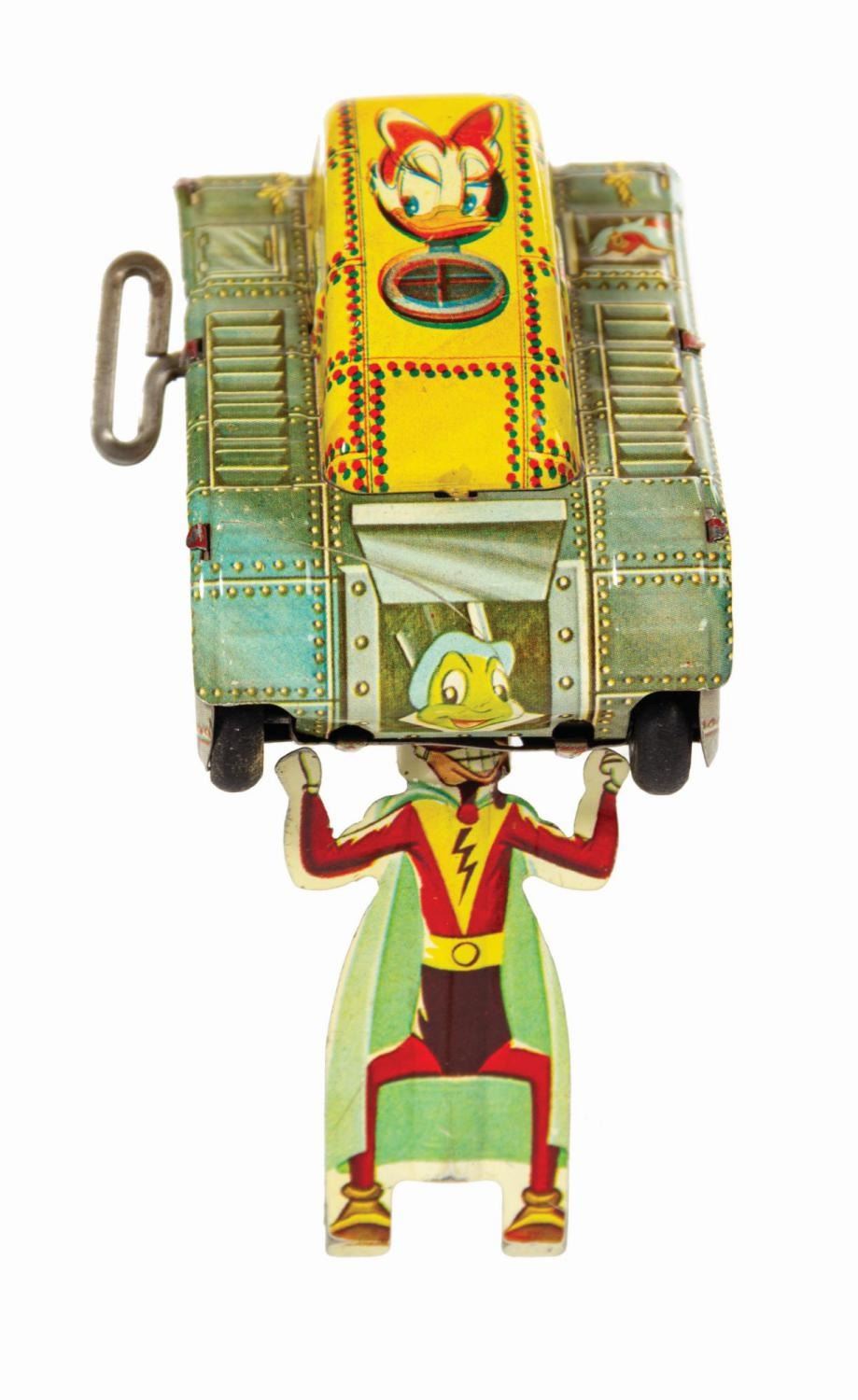 (Marx, c.1960s) A vintage Super Goof turnover tank tin-litho wind-up toy manufactured by Plastimarx. When wound, the tank is designed to roll and the flat figure of Goofy as his superhero alter ego, Super Goof, swings out and turns the tank up on its end. The winding key is present, and the Goofy figure can be moved manually, however the mechanism is jammed and will require service to restore functionality. Measuring 3"x3" and 4" deep, the piece is in very good condition with only minor surface scratching and wear.