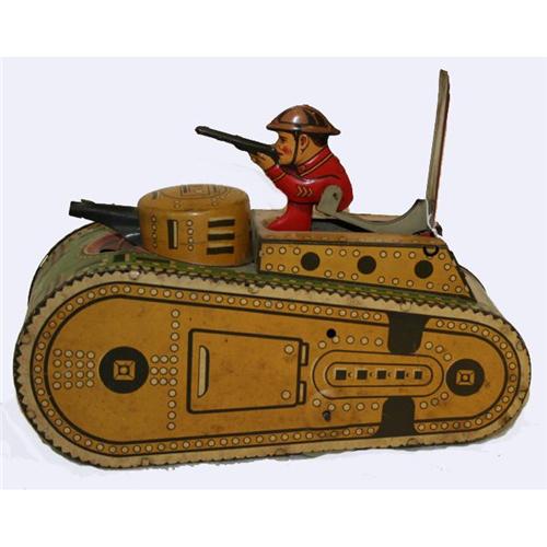 Marx circa 1930's tin wind-up toy tank measures approximately 10" L and 5 ½" H. The Marx circular logo and Made in USA Pat’s Pend’g are on the back of the tank.  There is a pop-up mechanism on top that projects a doughboy in WW I helmet..  The graphics and yellow, green, and red paint are good.  However, there are a few  scratches on bottom and  on the body and some discoloration of paint..  There is no key.