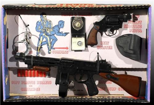 Description Includes original box. Unused condition with all items still attached to inside cardboard insert. Items include sparkling burp gun, cap and bullet shooting pistol with holster, badge, wallet with compass and a pair of handcuffs. Also, nine plastic bullets and cartridges are still sealed in plastic. Box has some creasing and shelf wear. Condition (Excellent). Size 13" x 21".