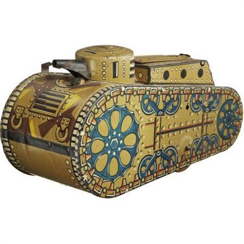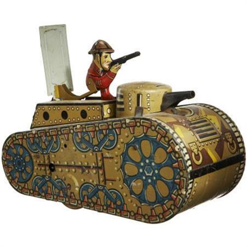 <B>"Marx Toys" Wind-up Tin Tank</B></I>, in working condition, although missing the keywind. Scuff marks are apparent along the sides and the turret shows light abrasions and rusting. Soldier pops out of the door. <BR><BR><b>Shipping:</b> Miscellaneous Collectibles, Larg (<a target="_blank" href="http://www.heritageauctions.com/common/shipping.php">view shipping information</a>)