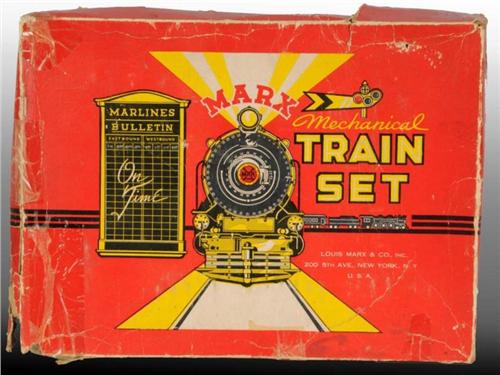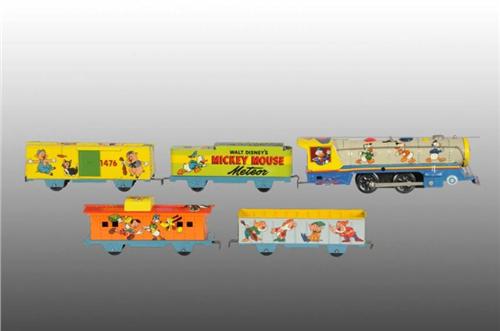 Description American. Train includes original box. Set includes Donald Duck locomotive, meteor tender, Three Pigs box car, Seven Dwarfs gondola and Pinocchio caboose. Also includes three individual box sleeves. Set shows very little wear but box is tattered. Condition (Excellent Plus).