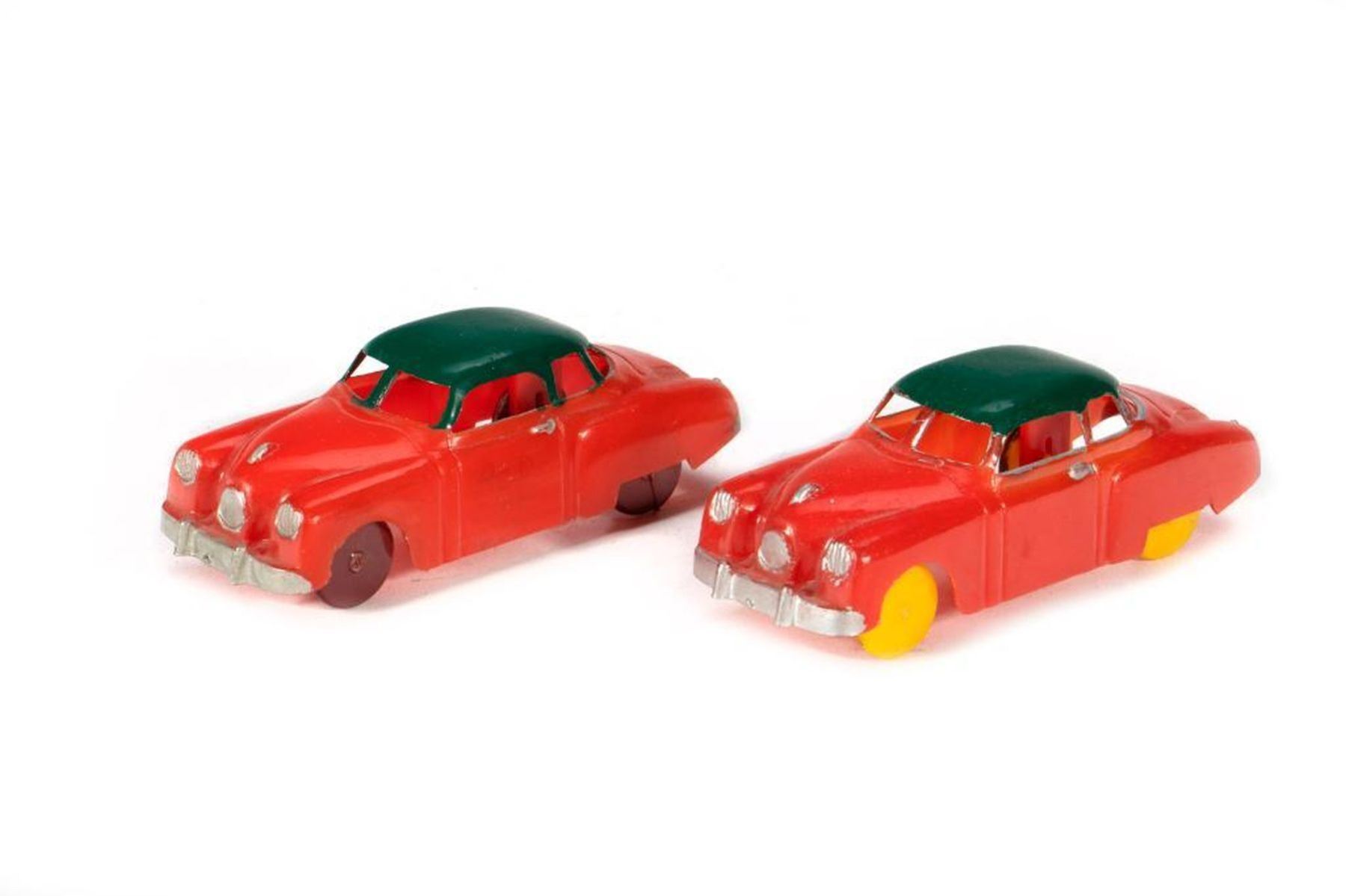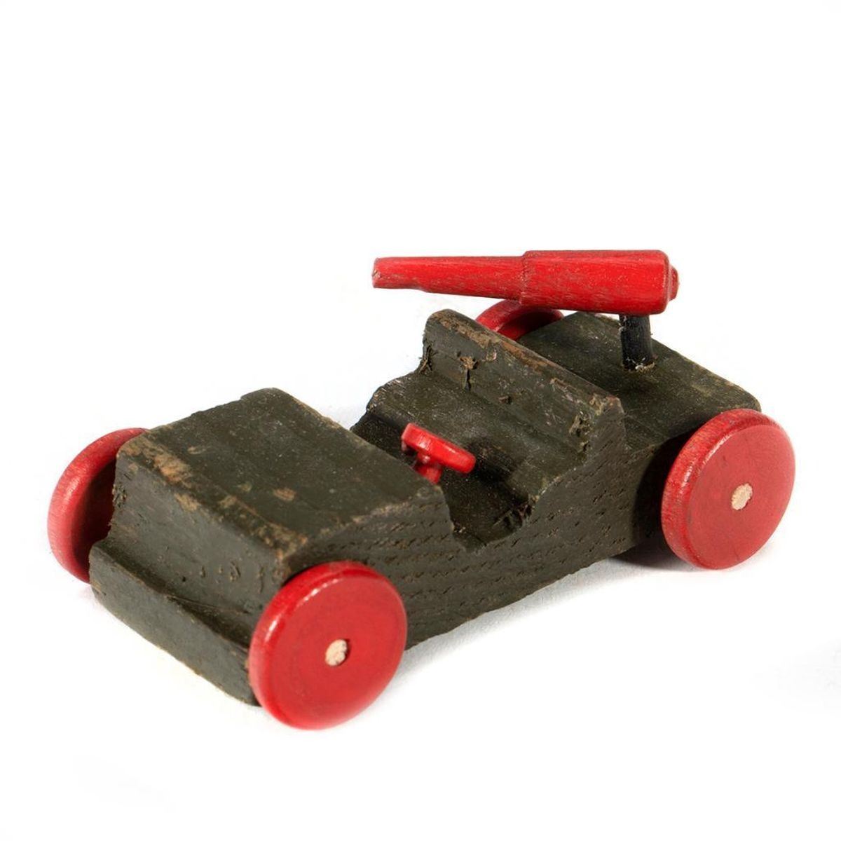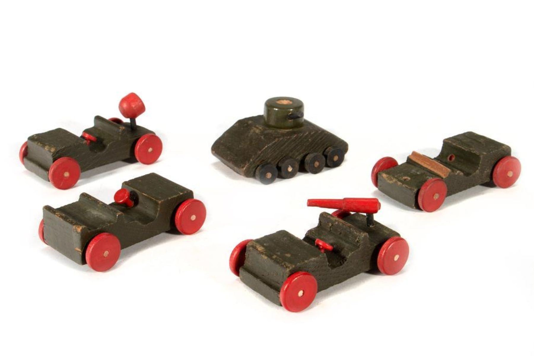 Marx Red Plastic Coupe, Marx Red Plastic Coupe, Marx Plastic Lumar Concrete Company Truck, (5) wood military vehicles