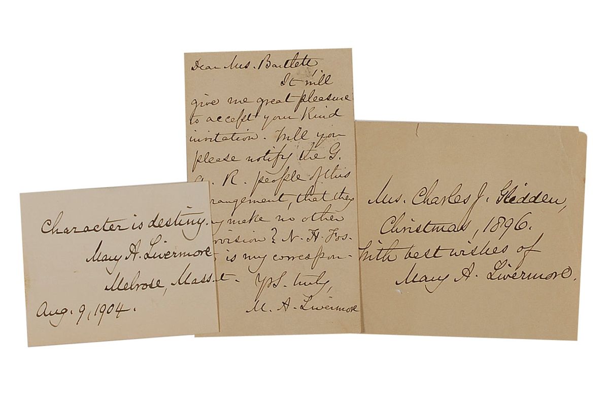 Suffragist, reformer, and editor of The Agitator and the Woman’s Journal. Three items: ALS signed “M. A. Livermore,” on the reverse of a beige 3 x 5 government postcard. Livermore writes to L. S. Weston Bartlett, in full: “It will give me great pleasure to accept your kind invitation. Will you please notify the G. A. R. people of this arrangement, that they may make no other provision? N. H. S. Foster is my correspondent”; and an AQS on an off-white 3.5 x 2.75 sheet. Livermore writes, “Character is destiny, Mary A. Livermore, Melrose, Mass., Aug. 9, 1904”; and an ANS on an off-white 4.5 x 4 sheet. Livermore writes, “Mrs. Charles J. Glidden, Christmas, 1896, With best wishes of Mary A. Livermore.” A horizontal fold to the AQS and a small tear and two small areas of paper loss to the top corners of the ANS, otherwise fine condition.