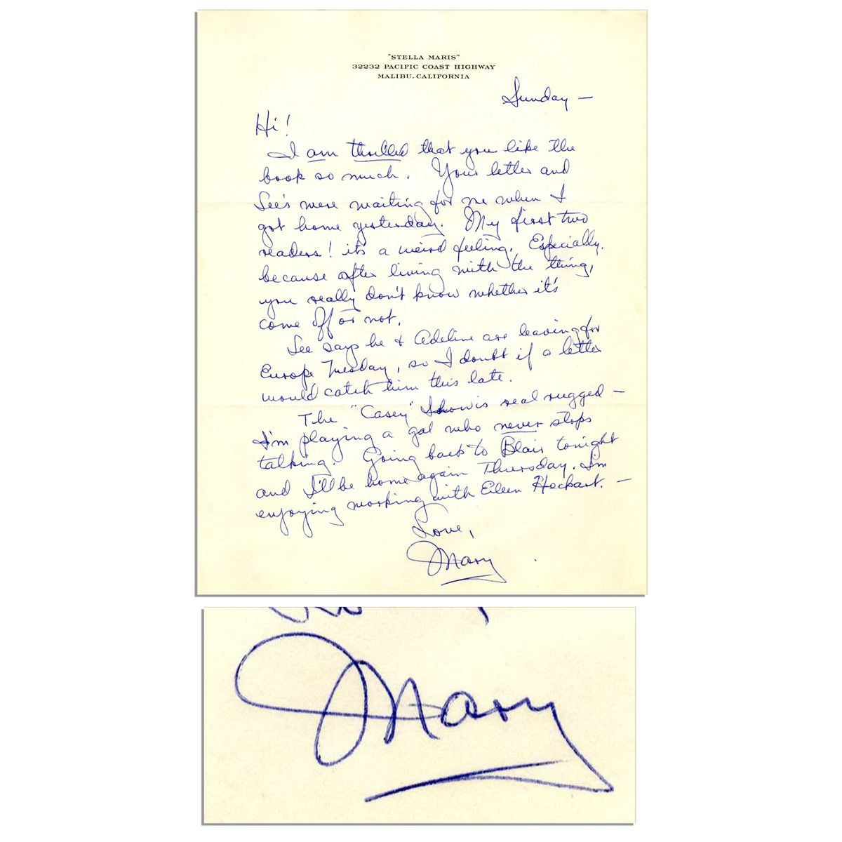 Academy Award-winning actress Mary Astor autograph letter signed. Astor's letter, likely to her agent Gloria Safier in New York is dated simply ''Sunday'' and reads in part, ''I am thrilled that you like the book so much...Especially because after living with the thing, you really don't know whether it's come off or not...The 'Casey' Show is real rugged -- I'm playing a gal who never stops talking. Going back to Blair tonight and I'll be home again Thursday...'' Signed ''Mary'' in blue ink, single-page letter measures 8.5'' x 11''. Minor folds, else near fine.