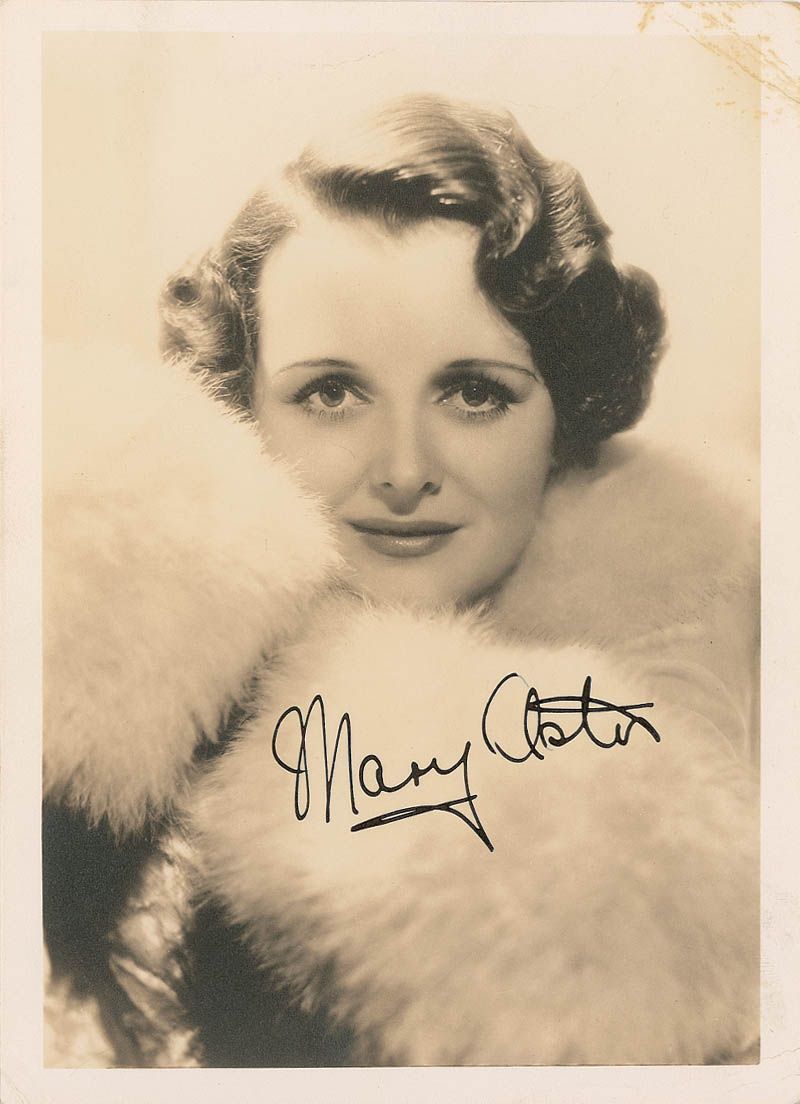 Vintage matte-finish 5 x 7 photo of Astor wearing fur, boldly signed in black ink. Creasing to the corners and upper border, and soiling to the upper right, otherwise fine condition.