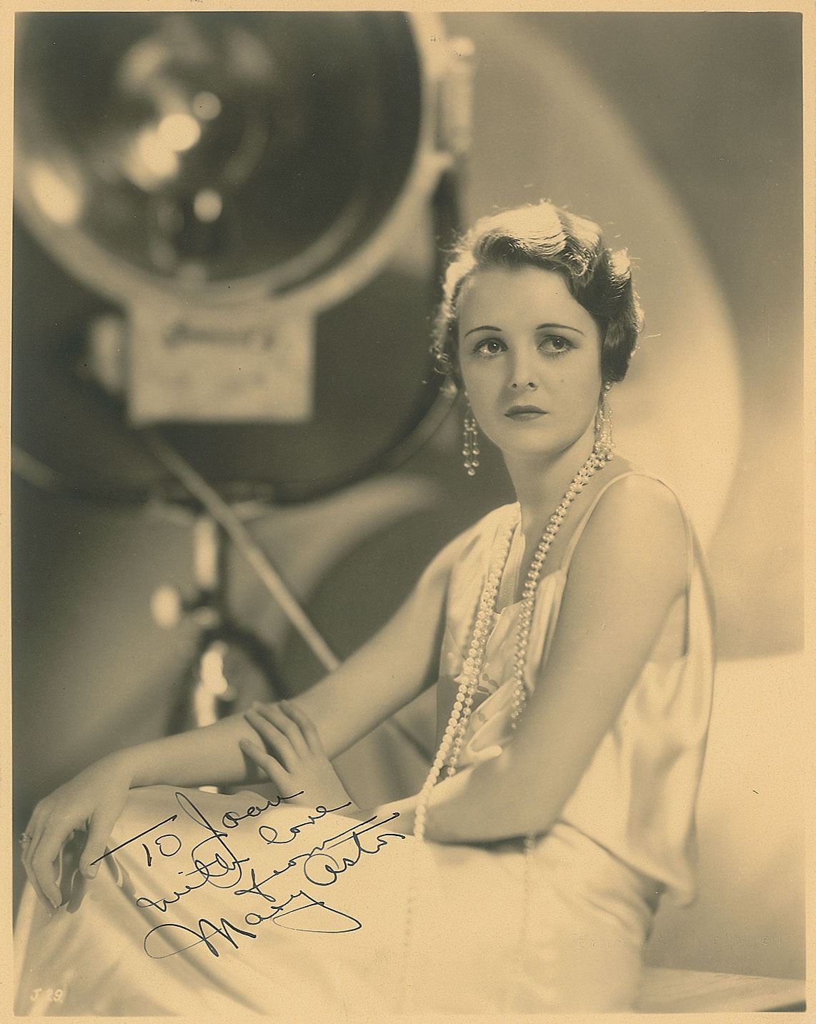 Vintage sepia matte-finish 7.75 x 9.75 Bachrach photo of Astor posing on a movie set, signed and inscribed in fountain pen, "To Joan, with love from Mary Astor." In fine condition.