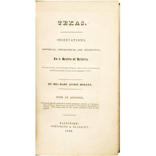 <B>Mary Austin Holley: </B></I><B><I>Texas. Observations, Historical, Geographical and Descriptive</B></I></B></I>, <I>In a Series of Letters, Written During a Visit to Austin's Colony, with a view to a permanent settlement in that country, in the Autumn of 1831. By Mrs. Mary Austin Holley. With an Appendix, Containing specific answers to certain questions, relative to Colonization in Texas, issued some time since by the London Geographical Society. Also, some notice of the recent political events in that quarter. </B></I>(Baltimore: Armstrong & Plaskitt, 1833). First edition of the first book in English entirely about Texas. Twelvemo ( 7" x 4.5"). 167 pages with appendix. Folding map: <I>Map of the State of Coahuila and Texas</B></I>. W. Hooker (13" x 10"). Brown cloth lettered in gilt. Ink stamp to the bottom edge, light rubbing and fading, rear hinge cracked but sound. Light to moderate occasional foxing. Altogether, a very good copy. Housed in a cloth chemise and quarter morocco slipcase. The work is an epistolary account of the author's journey in the fall of 1831. The first book written in English devoted entirely to Texas. Mrs. Holley was a cousin to Stephen F. Austin, to whom the book is dedicated. She visited Texas in 1831, and was enthusiastic about the country and its prospects. In this series of letters she described the natural features, and the political, economic, and social life, concluding that "ones feelings in Texas are unique and original, and very like a dream or youthful vision realized." Streeter 1135: "This is the first book in English entirely on Texas. For a long time I have regarded it as one of the Texas classics." In his Introduction, Streeter states that this has long been one of his favorite books on life and travel in Texas. Holley and Austin had hoped to use Austin's original map, published by the Philadelphia map publisher H.S. Tanner, for the book, but Tanner refused, and they were obligated to make use of another map based on Austin's sources, by the engraver William Hooker. It is one of the earliest maps of Texas to show the entire territory, including the Panhandle, and one of the first to identify the vast land grants awarded to the earliest settlers. <I>From the collection of Darrel Brown.</B></I><BR> <BR><B>Reference:</B></I> Howes H593. Sabin 32528. Texana, <I>Colonisation</B></I> 10; Library of Congress Exhibition 74: "An early Texas literary classic." Jenkins, <I>Basic Texas Books</B></I>, 93. Graff 1924.<BR><BR><b>Shipping:</b> Books & Catalogs (<a target="_blank" href="http://www.heritageauctions.com/common/shipping.php">view shipping information</a>)