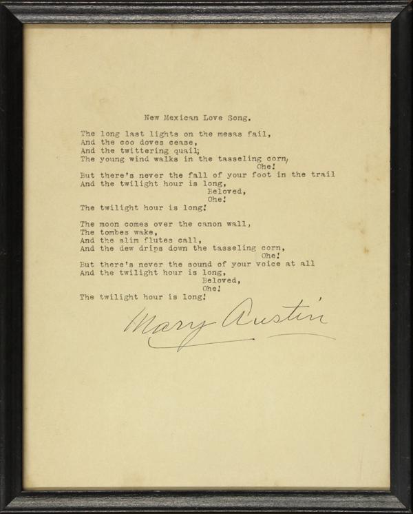 Mary Austin signed poem, ''New Mexican Love Song'', typewritten with an ink signature, framed 10.5''h x 8.75''w