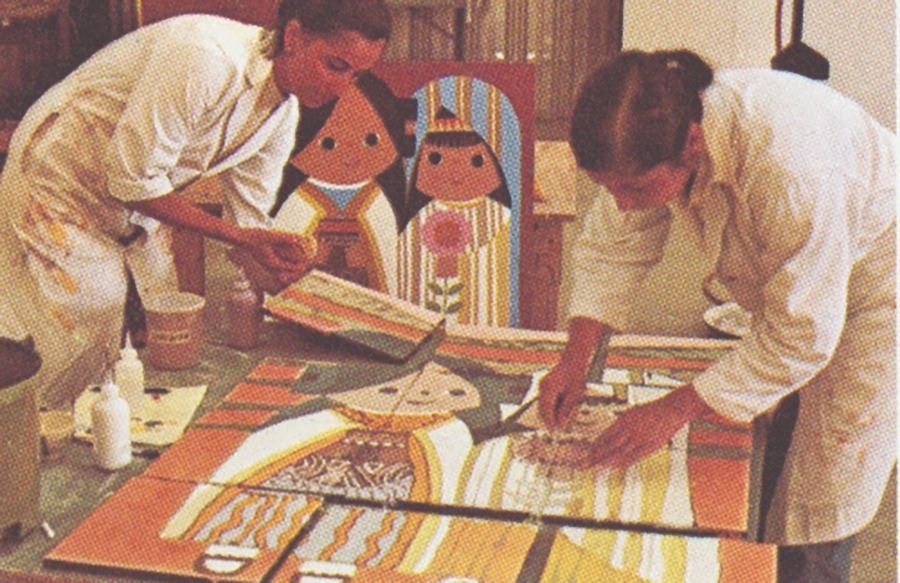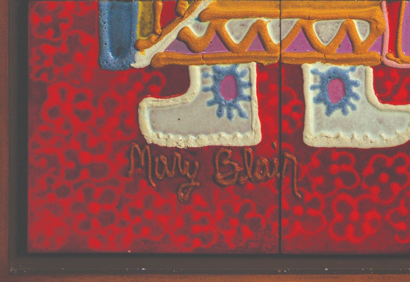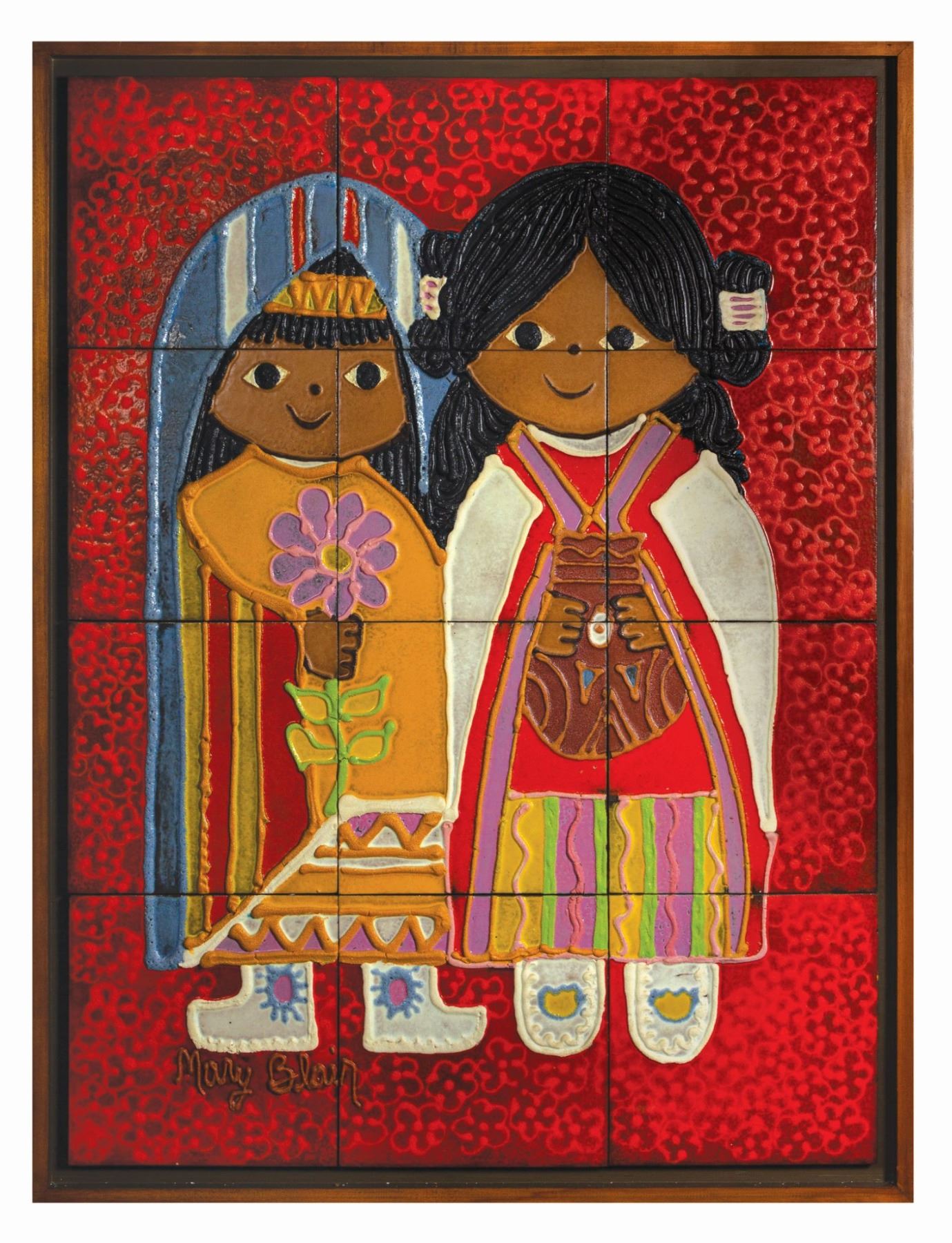 (Contemporary Resort, 1971) An incredible prototype tile display created by Disney Legend Mary Blair for her large mural at the Contemporary Resort Hotel. Blair's vibrant and stylish mural has become a Walt Disney World landmark in its own right, and this ceramic tile artwork was originally created by Blair as her pitch to show the process by which she would create the final mural. As a stunning piece of original Mary Blair artwork in its own right, the two characters depicted in this ceramic prototype even made it into the final mural seen within the Contemporary Resort. This artwork is composed of (12) tiles that together form the overall 46.5"x35" image. Blair signed the artwork along the bottom in raised ceramic letters. This piece was returned to Blair from WED as a thank you for her contributions to the mural, and was proudly displayed by Blair at her home for many years. The piece was later offered by the Mary Blair Family Trust following her death. This artwork is an incredible testament to the talent of one of Disney's most iconic artists, and is also a significant artifact in the history of Walt Disney World. The condition is very fine, with minor wear from previous display and its original use. This item will require special shipping arrangements. Please contact us for details and estimates.