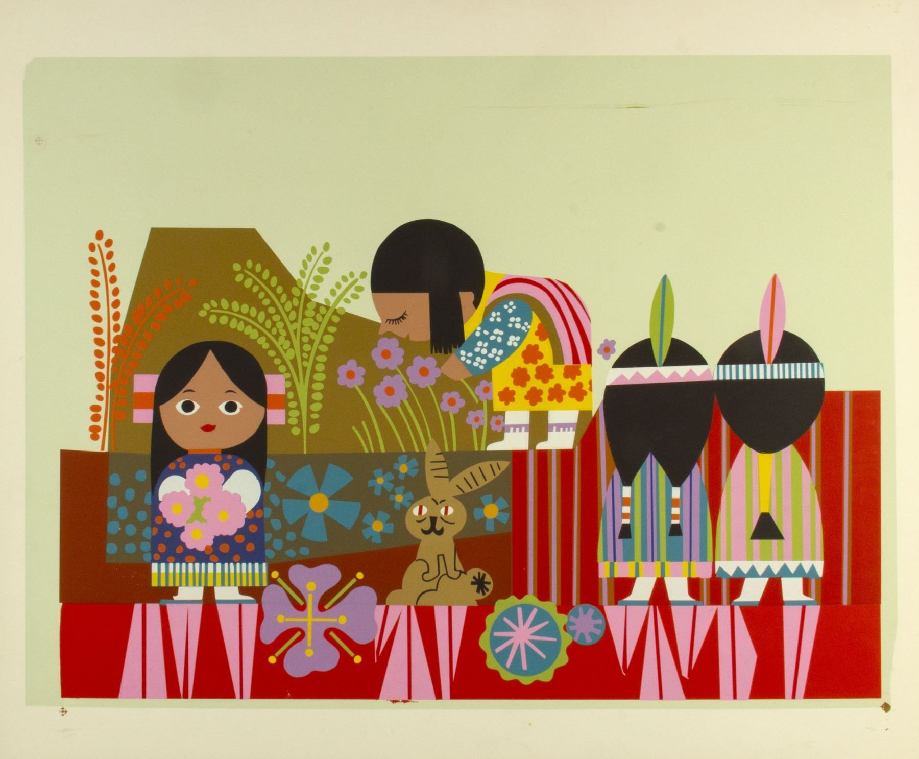 (Contemporary Resort, c.1970s) A larger sized silkscreened test print for artwork to be displayed at Walt Disney World's Contemporary Resort. This artwork, created by Disney Legend Mary Blair, is one of a series of stylish art prints that were used in the Contemporary Resort Hotel from 1971 through the 1980s. Measuring 30"x36", the artwork has silkscreen printing registration marks in the bottom corners, and lacks the "Walt Disney Productions" copyright line which would appear in the finalized display versions of these prints. The artwork is in good condition with minor surface wear from use including a thin green streak near the top-edge and some scuffs in the margins.