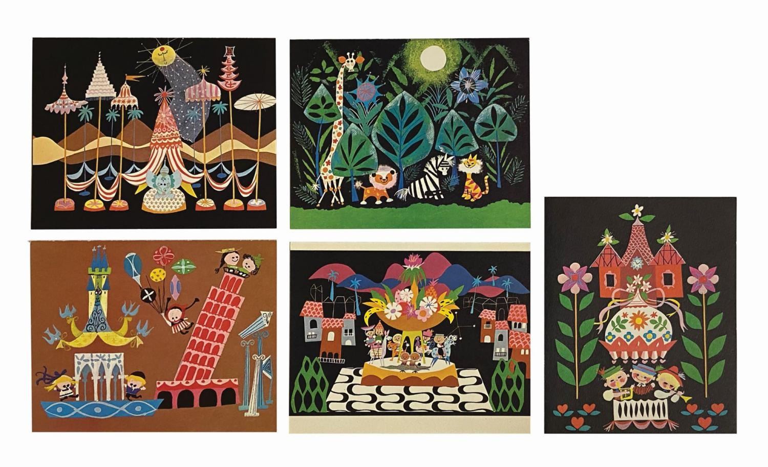 (Disney, 1964-65) A set of (10) greeting cards designed by Mary Blair based on her original concept artwork for the It's a Small World attraction at the 1964-65 New York World's Fair. The set consists of five unique designs with two examples of each. Every card is accompanied by an envelope and all are presented in the original cardboard box packaging with Mary Blair lid art. The cards measure 5.75"x4.6" and are in very good condition with wear along the spines. The box is 6.5"x5.25" and 0.75" deep and exhibit a price tag remnant on the bottom edge, light adhesive residue, spot darkening, and surface wear at upper left with the phrase "Blank Cards" etched into the lid.