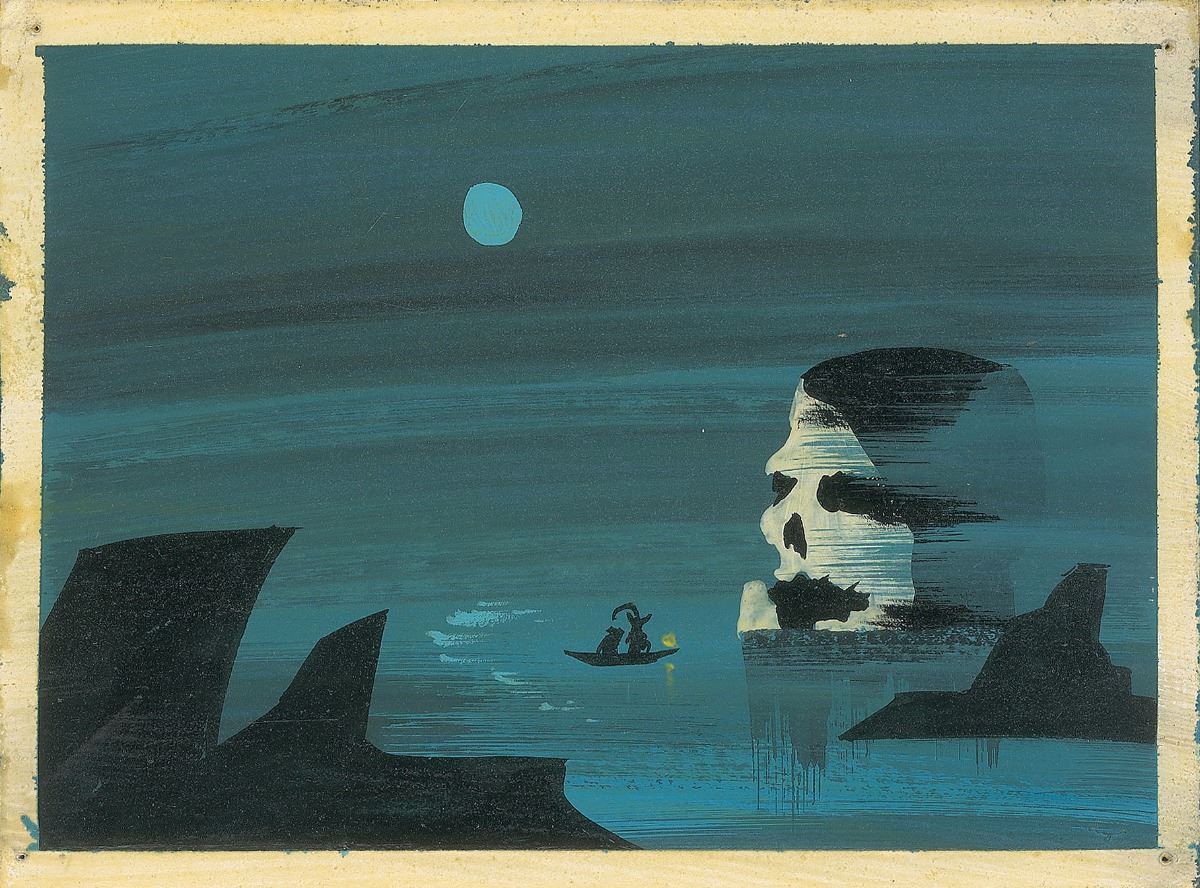(Walt Disney Studios, 1953) Original concept art by Mary Blair featuring Captain Hook and Mr. Smee from Peter Pan, showing them slowly rowing towards Skull Rock in the dark of night. Accomplished in tempera on 7 x 5 artist’s board. In fine condition, with trivial soiling to borders and tack holes to corners. A fine example that captures the haunting essence of this setting.