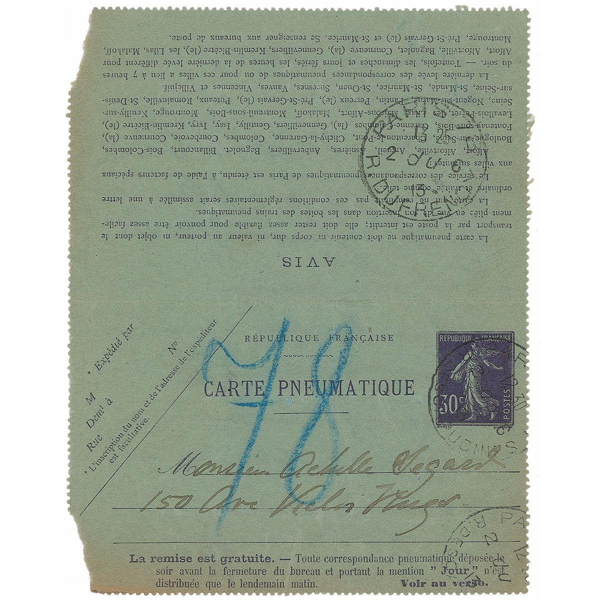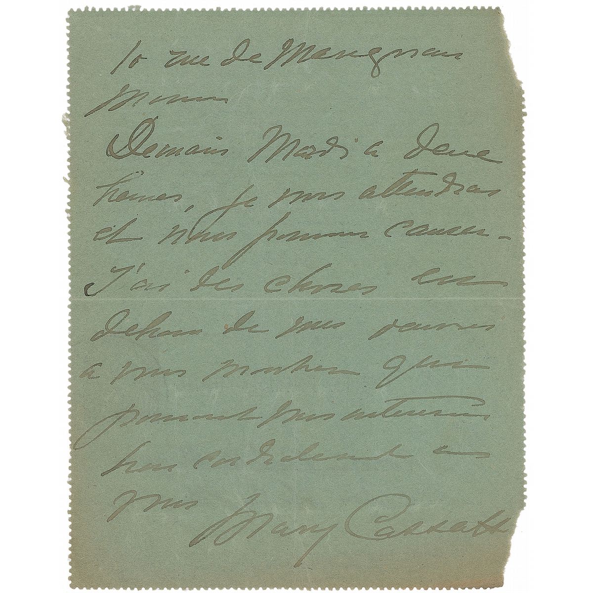 ALS in French, one page on a 4.5 x 5.5 French ‘Carte Pneumatique,’ postmarked June 2, 1913. Letter to her biographer, art critic Achille Segard, in full (translated): “Tomorrow, Tuesday at two, I will be waiting for you so that we can talk. I have many things to show that may interest you, apart from my own works.” Scattered creases, light edge toning, and paper loss to two corners (affecting no writing), otherwise fine condition. In this same year Segard published the monograph Mary Cassatt: Peintre des Enfants et des Meres, which contained a biography of the artist, a list of public and private collections in which her work was held, and a bibliography. A sought-after letter by the influential painter with a close artistic association.