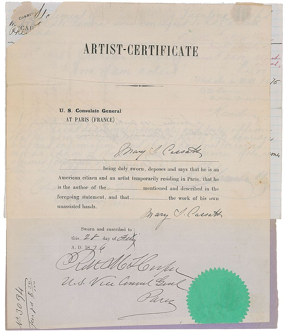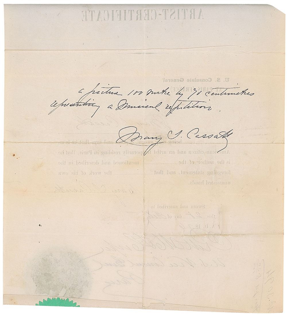 Extremely rare partly-printed DS, signed three times, “Mary S. Cassatt,” one page both sides, 8 x 10, February 28, 1876. Customs declaration allowing the export of a painting from Philadelphia valued at $400, filled out by Cassatt, who adds a two-line description of the painting on the reverse which reads, “a picture 100 metre by 70 centimetres representing a Musical Repetition. Mary A. Cassatt.” Document is also signed at the conclusion by the US Vice Consul General, and a manuscript customs form signed by her father, Robert Simpson Cassatt, is affixed. In very good to fine condition, with intersecting folds, missing top left corner, scattered light creasing, and possibly trimmed edges.