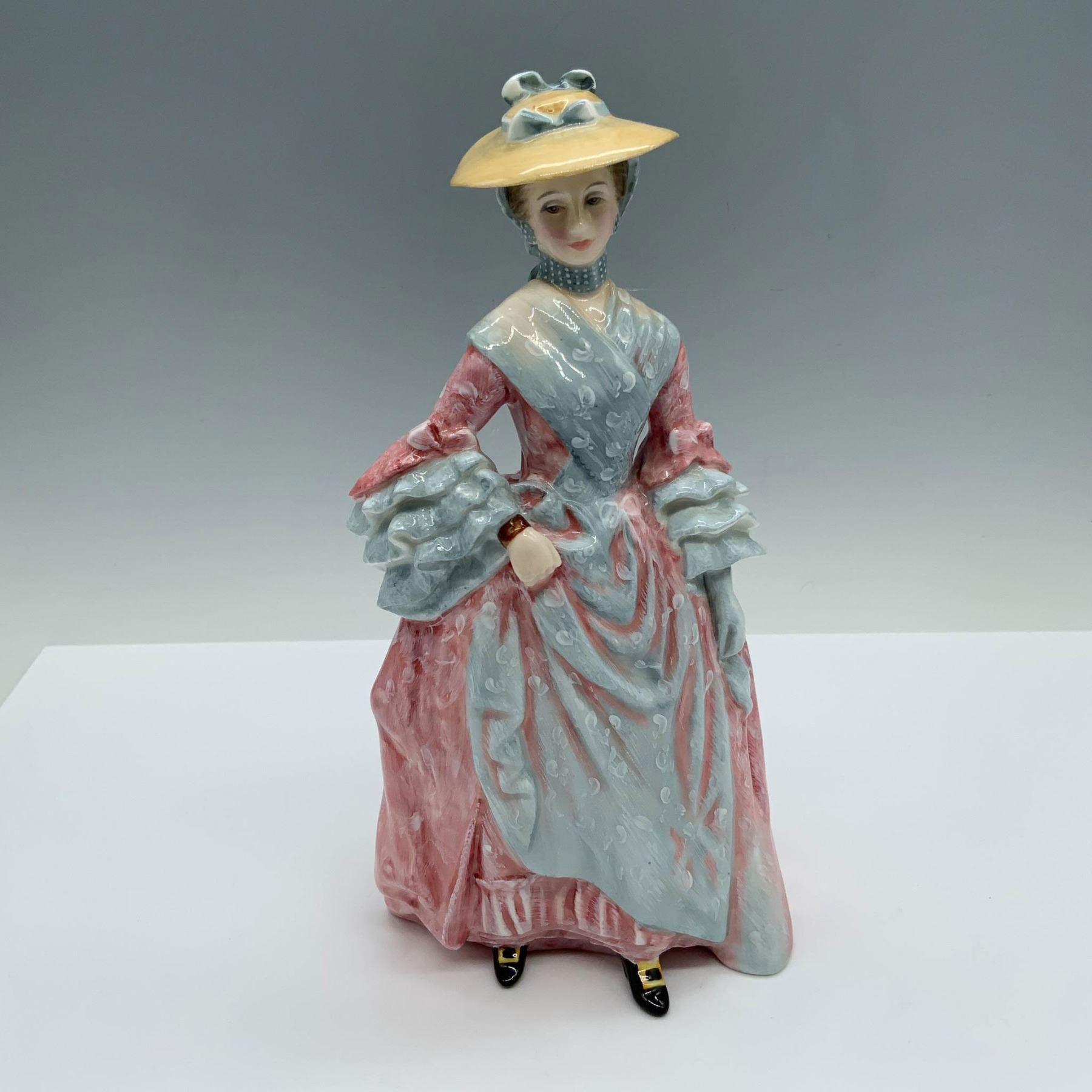 Limited edition handmade and hand decorated glossy figure from the Gainsborough Series that features a woman with an extravagant pink gown with blue frills and accents. Royal Doulton backstamp. Artist: Peter Gee