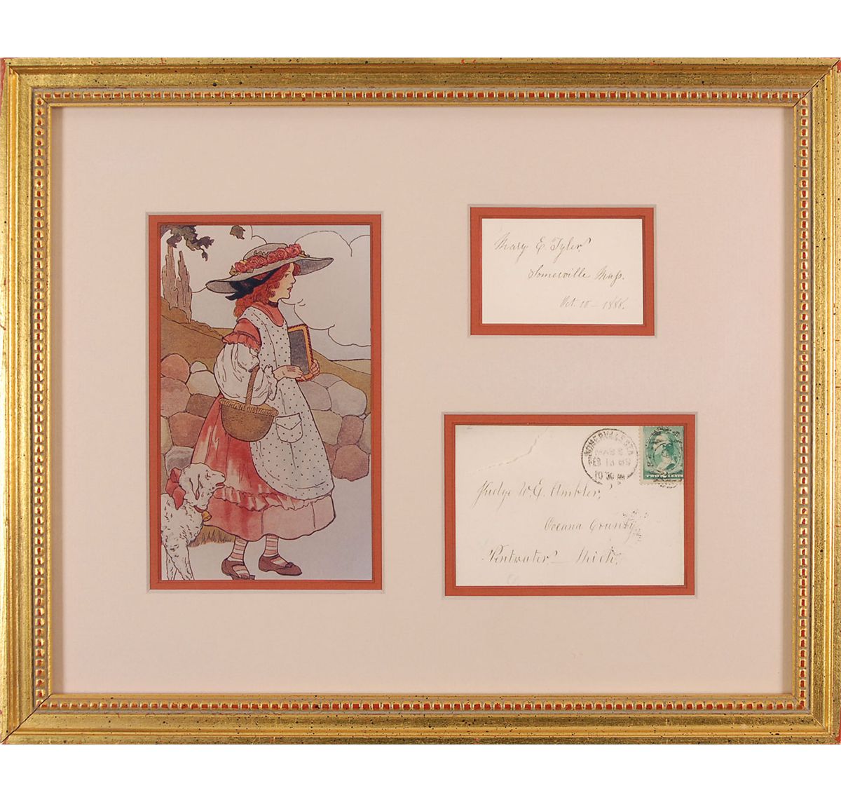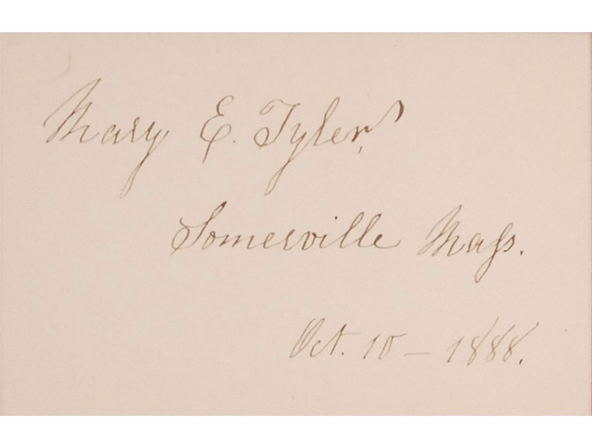 The girl who inspired the nursery rhyme ‘Mary Had a Little Lamb’ after she brought her pet lamb to school one day. Ink signature, “Mary E. Tyler, Somerville, Mass., Oct. 18, 1888,” on an off-white 3 x 2 card. Nicely double-matted and framed with the original mailing envelope (filled out in her own hand) and an illustration of the song to an overall size of 15.5 x 12.5. In fine condition. The first example we’ve offered.