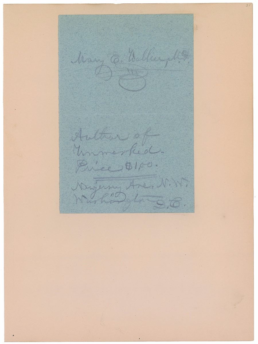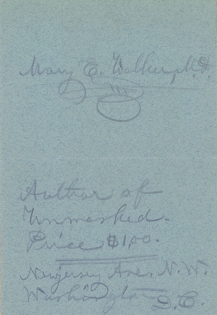 Physician and feminist (1832–1919) who served as an assistant surgeon during the Civil War, was imprisoned by the Confederates, and won a Congressional Medal of Honor for Meritorious Service. Pencil signature, “Mary E. Walker, M. D., Author of Unmasked, Price $1.00, New Jersey Ave. N. W., Washington, D. C.,” on a blue 4 x 6 sheet affixed to a 7.5 x 10 sheet. In fine condition.