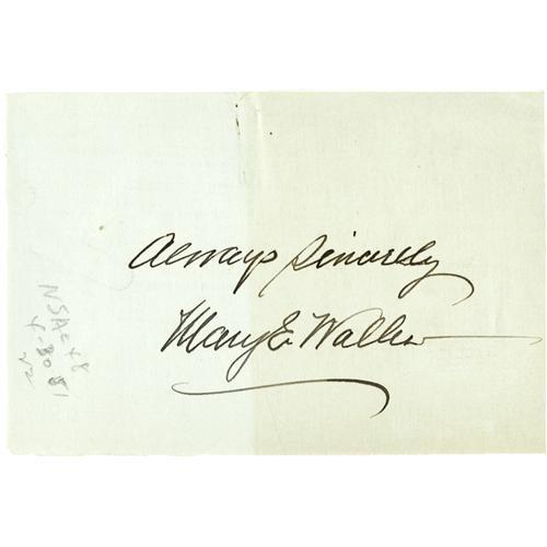 <B>Mary E. Waller Sentiment Signed.</B></I> Autograph Sentiment Signed, 1 page, 5" by 3.25", reading "<I>Always Sincerely, Mary E. Waller.</B></I>" In fine condition. A handsome memento of this popular early 20th century New England novelist. From the Henry E. Luhrs Collection.