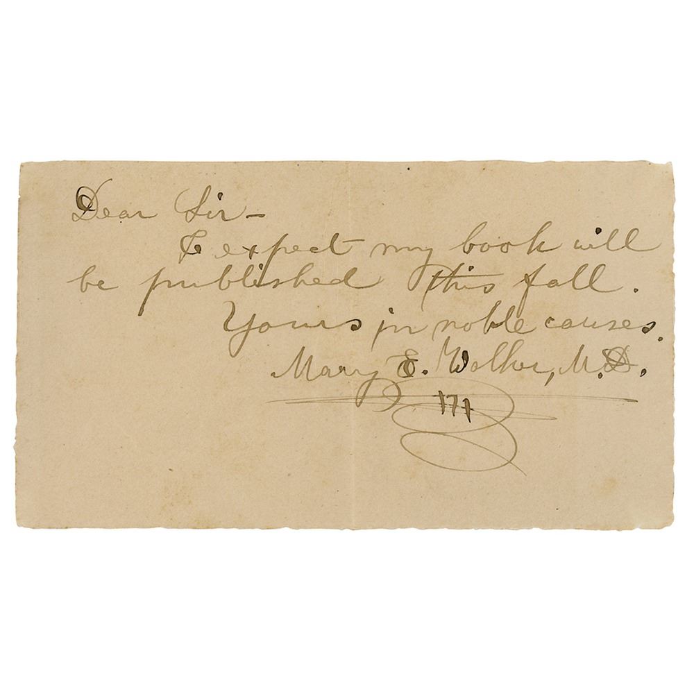 The only woman to receive the Congressional Medal of Honor for her service during the Civil War, Dr. Mary E. Walker (1832-1919) was a surgeon, a public lecturer, and an outspoken champion of women's rights. One of the first women in the country to be awarded a medical degree, she served as an assistant surgeon for the 52nd Ohio Infantry and was cited for valor in going behind enemy lines to attend to the sick. ALS signed “Mary E. Walker, M.D.,†one page, 6 x 3.25, no date. Brief handwritten letter, in full: "Dear Sir—I expect my book will be published this fall. Yours in noble causes." In fine condition, with a central vertical fold.