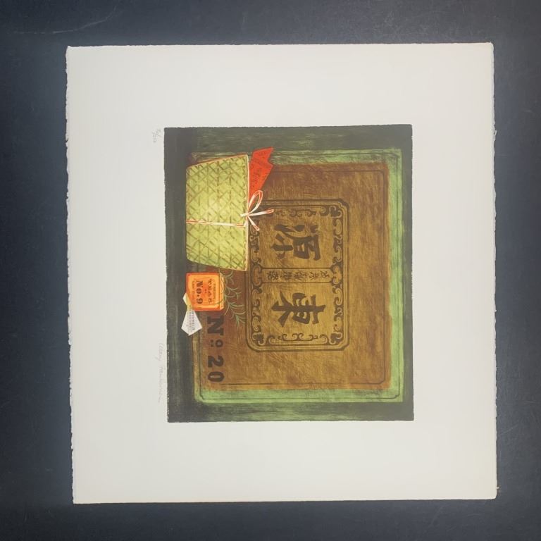 Mary Faulconer's "China Import" limited edition print, signed lower right, and numbered 118/250 lower left. An interesting piece of what appears to be items that been been imported from China, ad includes a basket, and teas. This piece is great condition, with a miniscule wrinkle upper left.