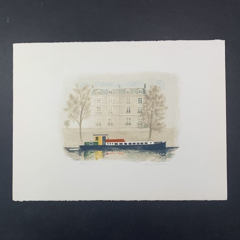Mary Faulconer's "Paris Barge" limited edition print, signed lower right and numbered 193/250 lower left. This piece is of a long boat in the water, in front a building. This piece is in excellent condition with very minor soiling lower left corner.