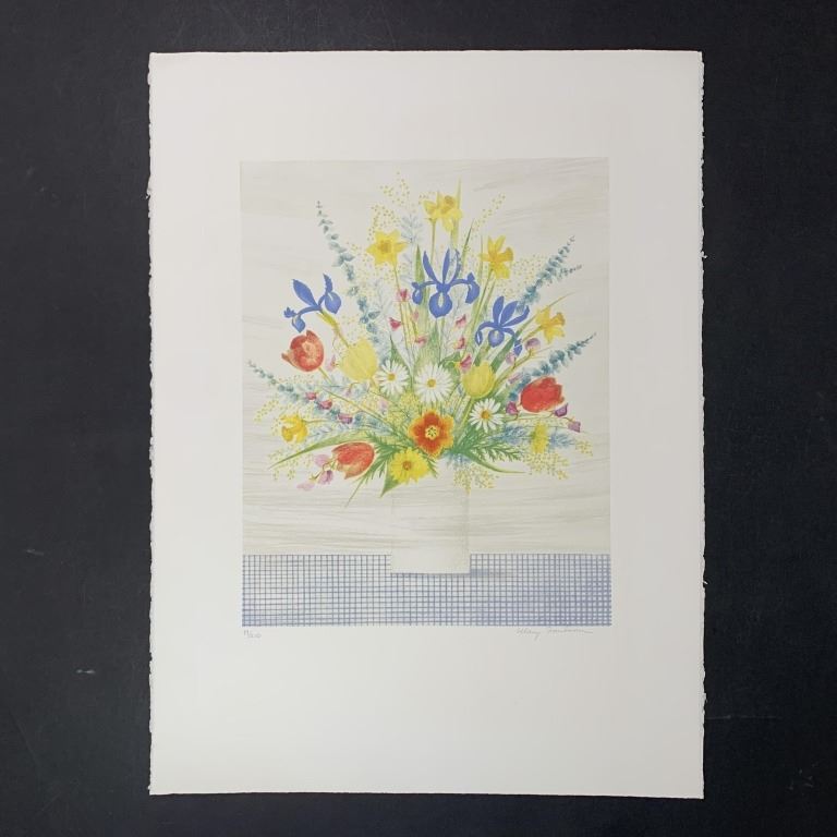 Mary Faulconer's "Spring Bouquet" limited edition print, signed lower right and numbered 89/250 lower left. This piece is of a colourful bouquet of flowers, in a white container, on top of a blue and white checkered table cloth. This piece is in near excellent concition with a very minor wrinkle upper left corner.
