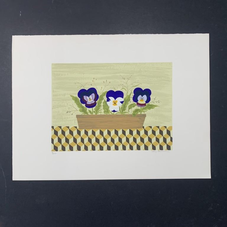 Mary Faulconer's "Three Pansies" limited edition print, signed lower right and numbered 96/250 lower left. This piece is of three purple pansies in a wood flower pot, and is in excellent condition