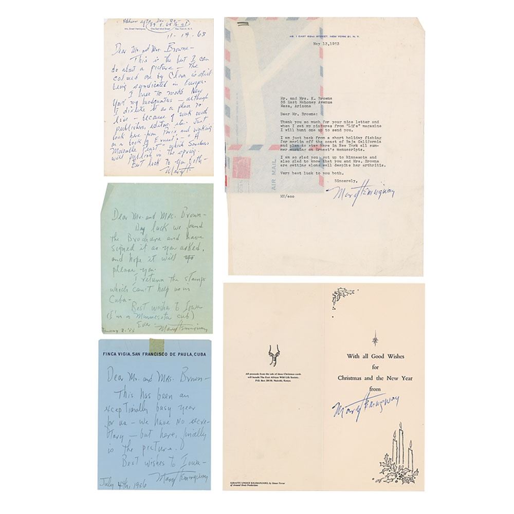 Four items: a Christmas card with giraffes under Mt. Kilimanjaro, measures 7.75 x 8 open, signed inside in ballpoint by Mary Hemingway; and a group of three ALSs and one TLS, four total pages, dated between 1955 and 1963. An ALS from November 17, 1963, in part: "I have to make New York my headquarters—although I dislike it as a place to live—because of work with publishers, editors, etc. Just back here from Paris and working on a book of Ernest's—'A Movable Feast,' which Scribner's will publish in the spring." The TLS, dated May 13, 1963, in part: "I am just back from a short holiday fishing for marlin off the coast of Baja California and plan to stay here in New York all summer working on Ernest's manuscripts." In overall fine condition. Accompanied by three unsigned Christmas cards and four original mailing envelopes, with a collector's hand adding Hemingway's surname to each.