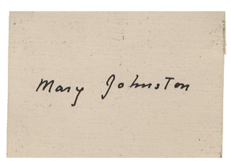 Mary Johnston (1870 – 1936). American novelist and women's rights advocate. Signed Card. 3 1/4" x 2 1/4". "Mary Johnston". Excellent.
