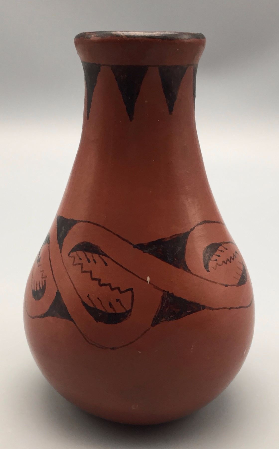 Maker: Mary Juan, Maricopa (1892 - 1977). Approx. Age: Circa 1930s - 50s. Size: Measures about 3 1/2” at it’s widest and 6” tall. Additional Info: Handmade pottery vase by the famous Maricopa potter, Mary Juan. Mary was one of the original members of the 1938 Maricopa Pottery Cooperative. Condition: Good for it’s age, normal wear and fading expected, no cracks apparent. Please look closely at the pictures - they are an important part of our description. Shipping: There will be a $8 handling / packaging fee for shipping this lot. The actual cost of postage will be added on top of that.