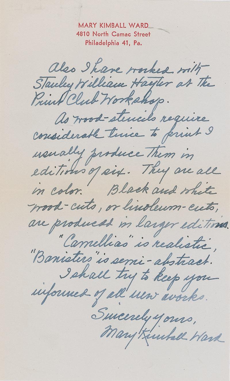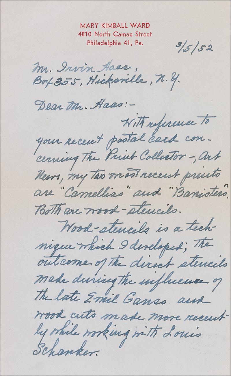 Artist. ALS, two pages, 5 x 8, personal letterhead, March 5, 1952. In part: “Wood-stencils is a technique which I developed; the outcome of the direct stencils made during the influence of the late Emil Ganso and wood cuts made recently while working with Louis Schanker. Also I have worked with Stanley Williams Hayter at the Print Club Workshop. As wood-stencils require considerable time to print I usually produce them in editions of six. They are all in color.” Several creases along the top of both pages and a strip of light toning across the central mailing fold, otherwise fine condition.