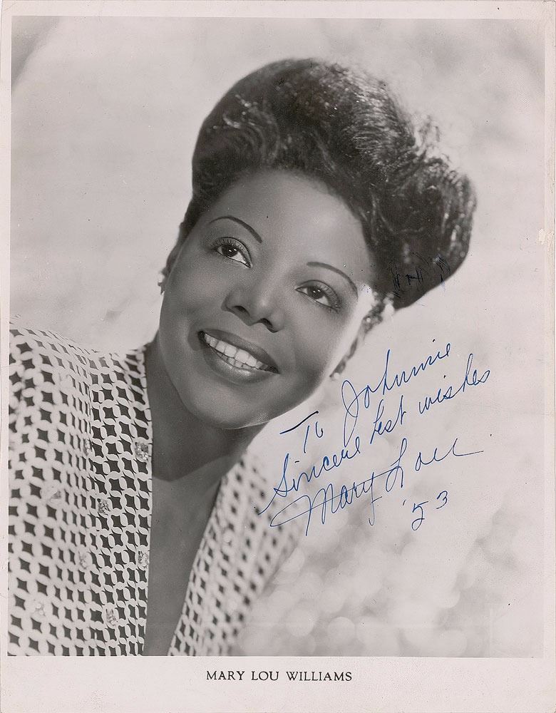 American jazz pianist, composer, and arranger (1910-1981). Vintage glossy 7.75 x 10 publicity photo of Williams in a lovely close-up pose, signed and inscribed in fountain pen, "To Johnnie, Sincere best wishes, Mary Lou, '53.” Reverse bears ownership ink notations. In very good condition, with trimmed edges, moderate overall creasing, and some light surface impressions.