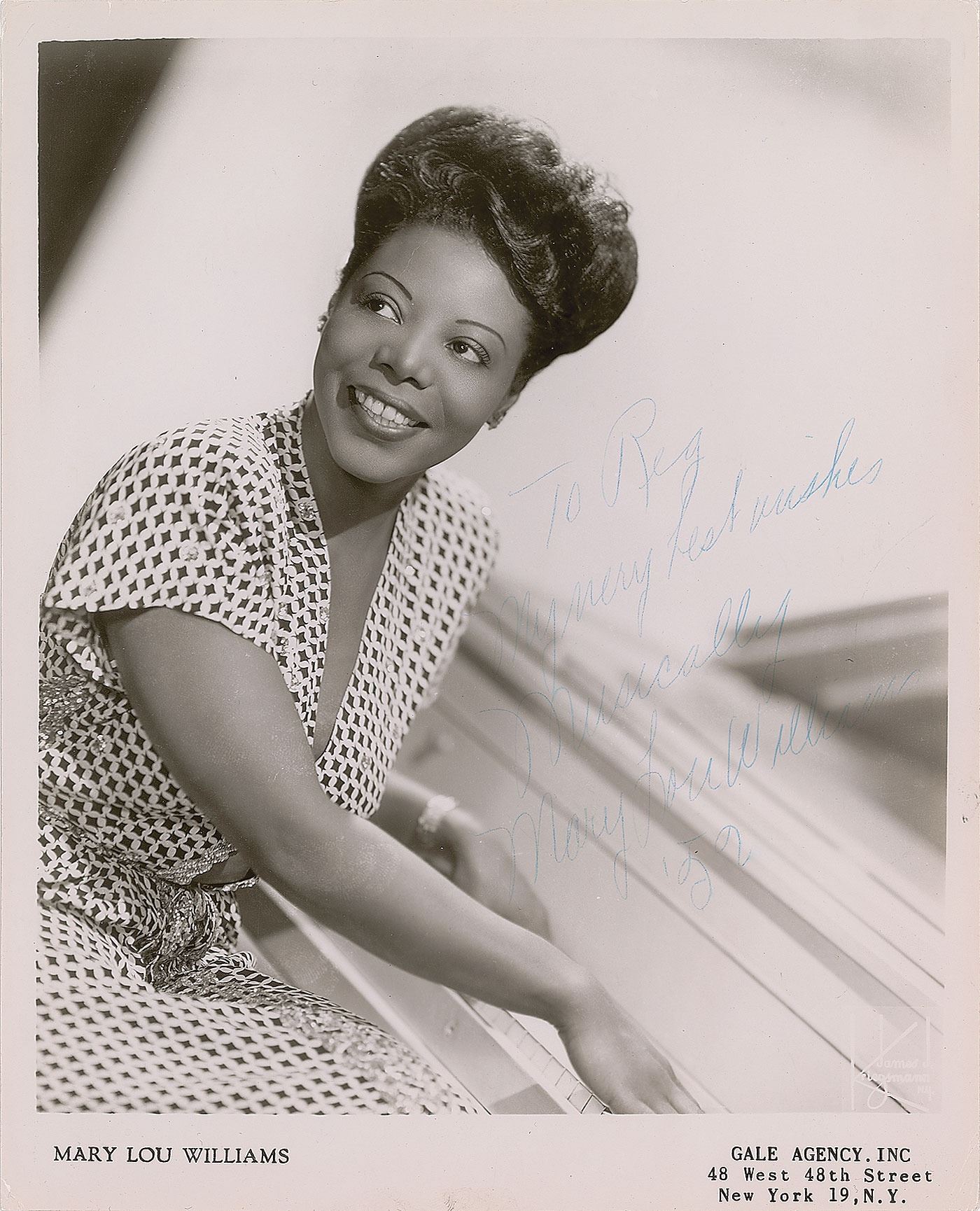American jazz pianist, composer, and arranger (1910-1981), who wrote and arranged for Duke Ellington and Benny Goodman, and was a friend, mentor, and teacher to Thelonious Monk, Charlie Parker, Miles Davis, Tadd Dameron, Bud Powell, and Dizzy Gillespie. Vintage glossy 8 x 10 James J. Kriegsmann publicity photo of Williams seated at a piano, signed and inscribed in blue ballpoint, "To Reg, My very best wishes, Musically, Mary Lou Williams, '52.” In fine condition, with a light vertical crease to her forehead.